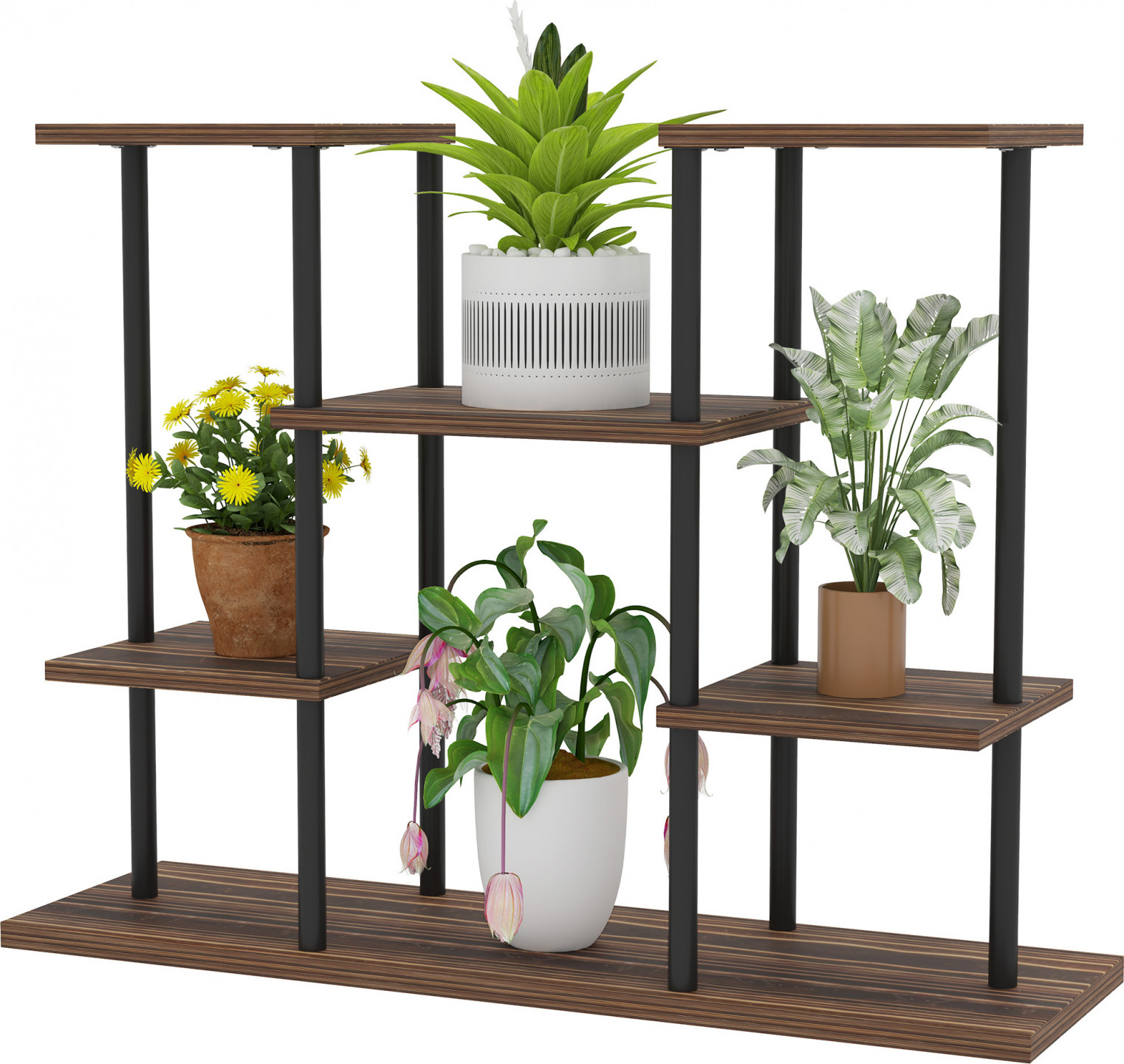 - Čtyřstupňový design schodiště na rostliny se přizpůsobí různým velikostem květináčů, což umožňuje efektivní využití prostoru.