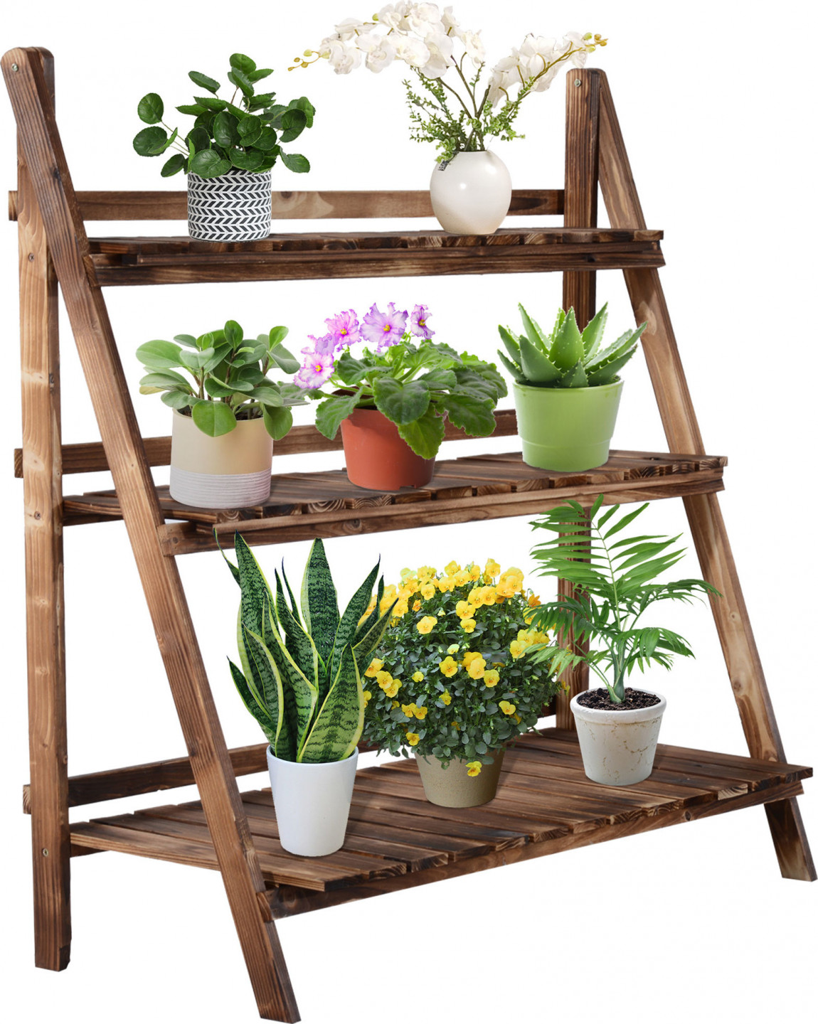 Toto rostlinné schodiště s celkem třemi stupni je ideální na balkon, terasu nebo do obývacího pokoje. Tři stupně dřevěného schodiště mají různou velikost, takže na ně lze umístit menší i větší květináče. Květinový regál je vyroben z masivního, robustního jedlového dřeva, takže je stabilní a odolný. Když se stojan na květiny nepoužívá, lze jej snadno složit a zabírá jen velmi málo místa.