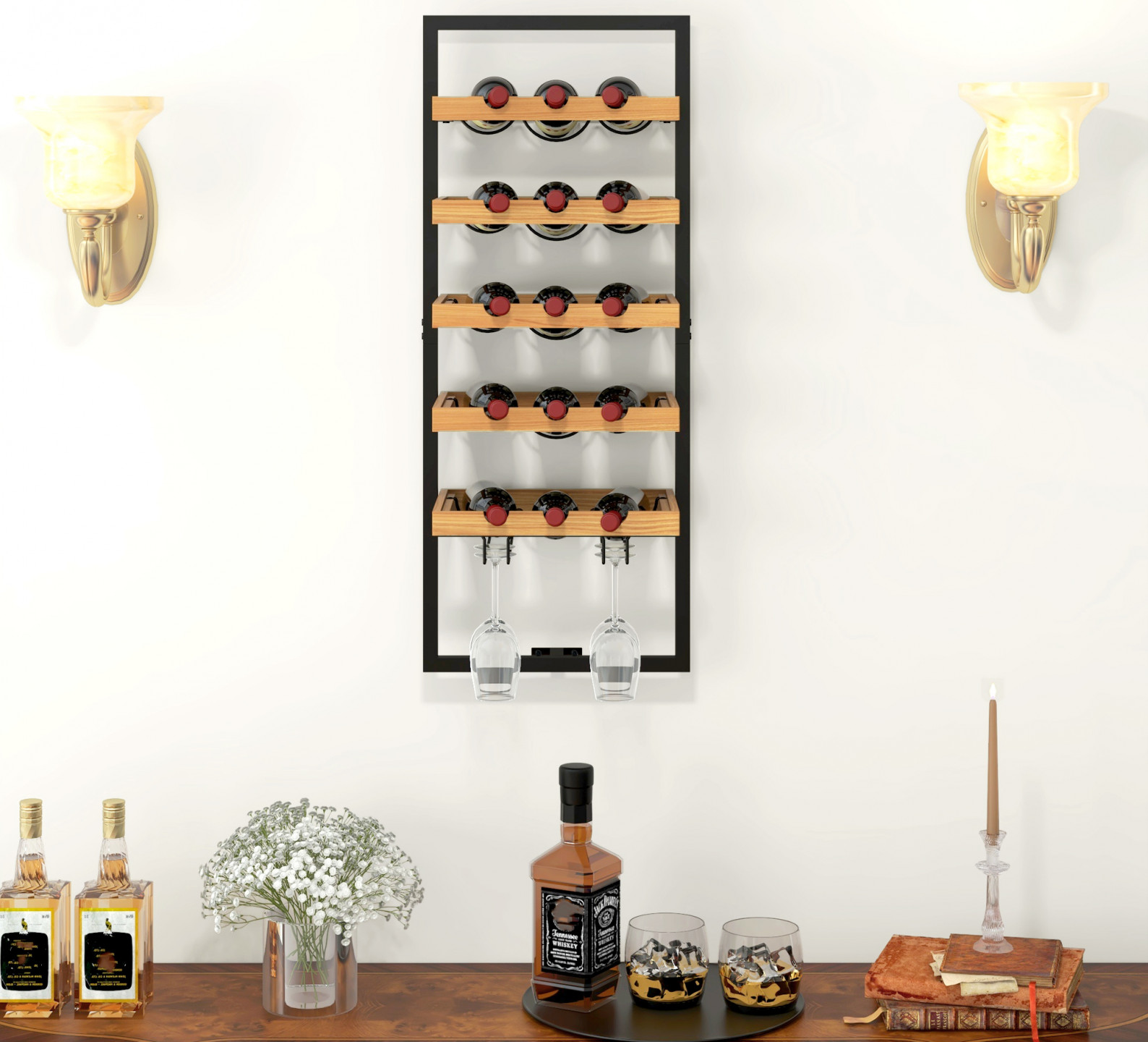 S nástěnnou vinotékou můžete skladovat víno jako profesionál. Elegantní design stojanu na láhve vína s 5 policemi a držákem na sklenice pojme 15 lahví a 4 sklenice, šetří místo a zajistí, že víno budete mít vždy po ruce. Svislé uložení stojanu na lahve zachovává vlhkost korku a prodlužuje trvanlivost vína. Nezbytná výbava pro každého milovníka vína!