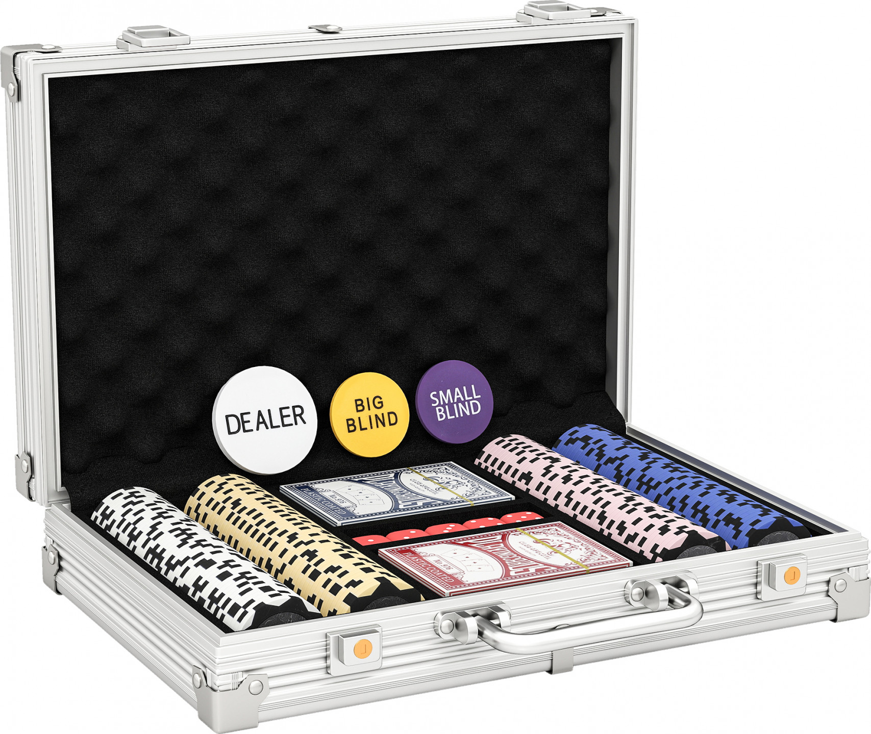 - Kompletní pokerová sada s 200 žetony, pěti akrylovými kostkami, dealerským tlačítkem, malým blindem, velkým blindem, dvěma balíčky karet a podložkou.