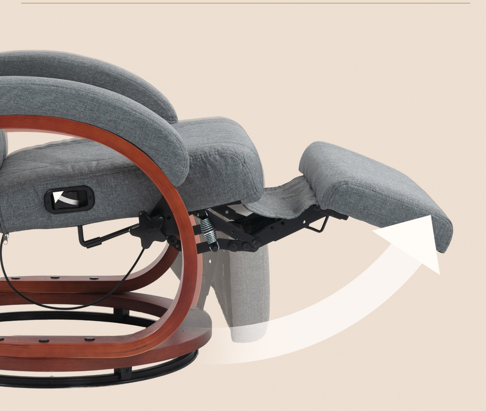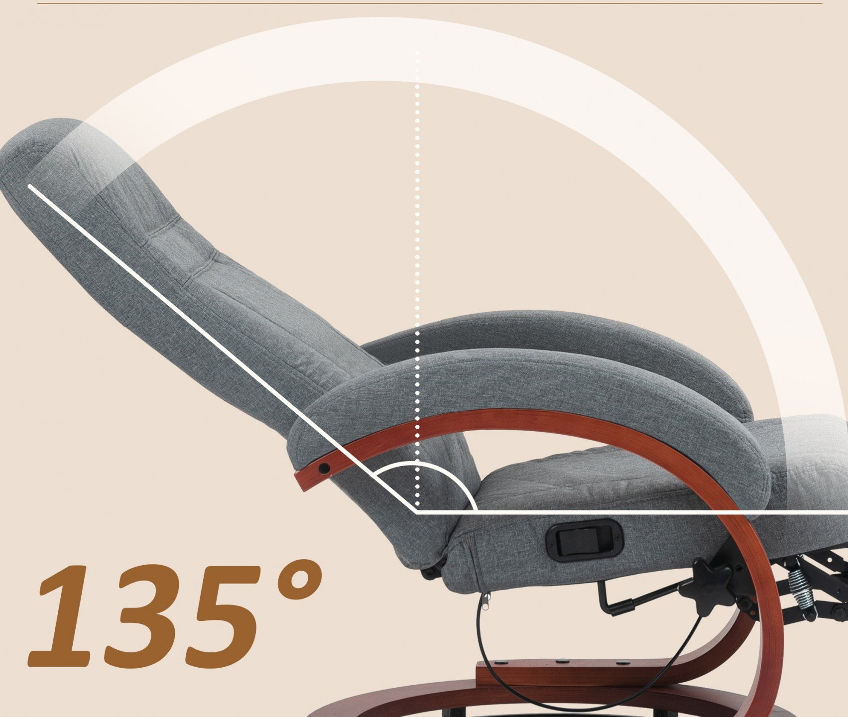Dopřejte si maximální pohodlí s polohovacím křeslem. Nastavitelné opěradlo (135°) a samostatná opěrka nohou přímo vybízejí k relaxaci. Vychutnejte si oporu, kterou poskytuje vysoký opěrák a prohnuté područky, které dokonale pohladí vaše tělo. Stylový potah televizního křesla ve vzhledu lnu dodá vašemu pokoji eleganci, zatímco dřevěná základna otočná o 360° zajistí bezkonkurenční volnost pohybu.