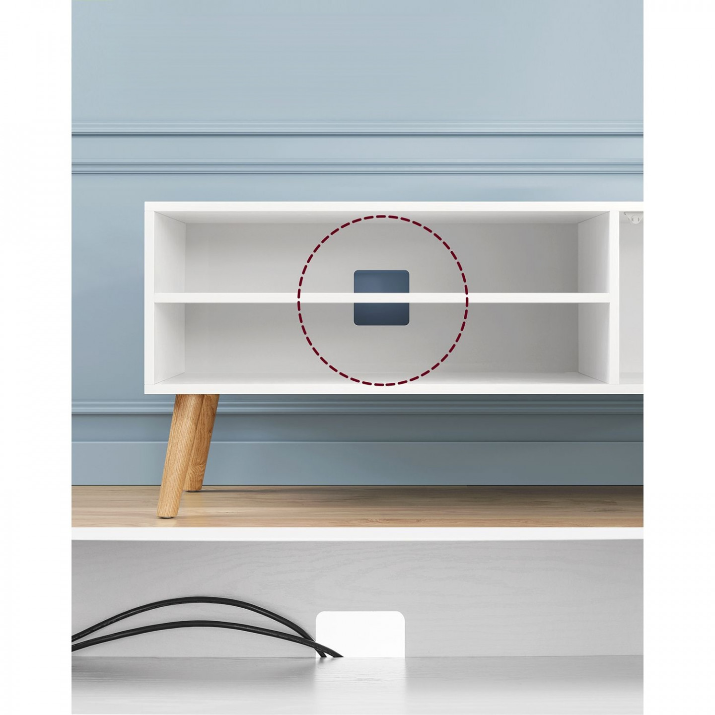 Dostatek úložného prostoru: 120 cm dlouhá deska stolu, 2 otevřené přihrádky ve spodní části a skříňka s dvířky - zde najdou vhodné místo vaše dálkové ovladače a herní konzole. Vysoce kvalitní dřevotříska a robustní nohy z gumového dřeva zajišťují vysokou stabilitu; tento televizní stolek unese až 100 kg