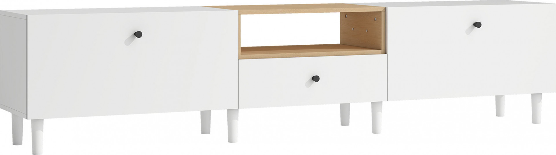 Užijte si pohodové večery, kdy je vše na svém místě. Televizní skříňka se dvěma odkládacími plochami, zásuvkou a otevřenou přihrádkou udržuje pořádek v konzolích a příslušenství. Plocha široká 200 cm unese televizory s úhlopříčkou až 90 palců. Tiché panty s měkkým dovíráním televizní lavice zajišťují tichý chod, zatímco bílý korpus, přírodní dřevo a černé detaily vnášejí do obývacího pokoje moderní hřejivý šarm.
