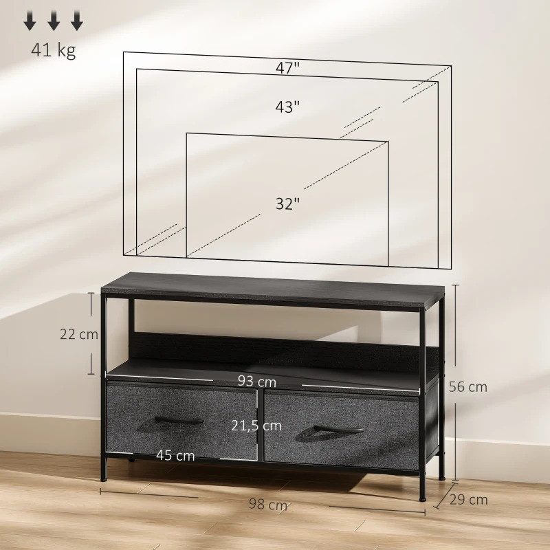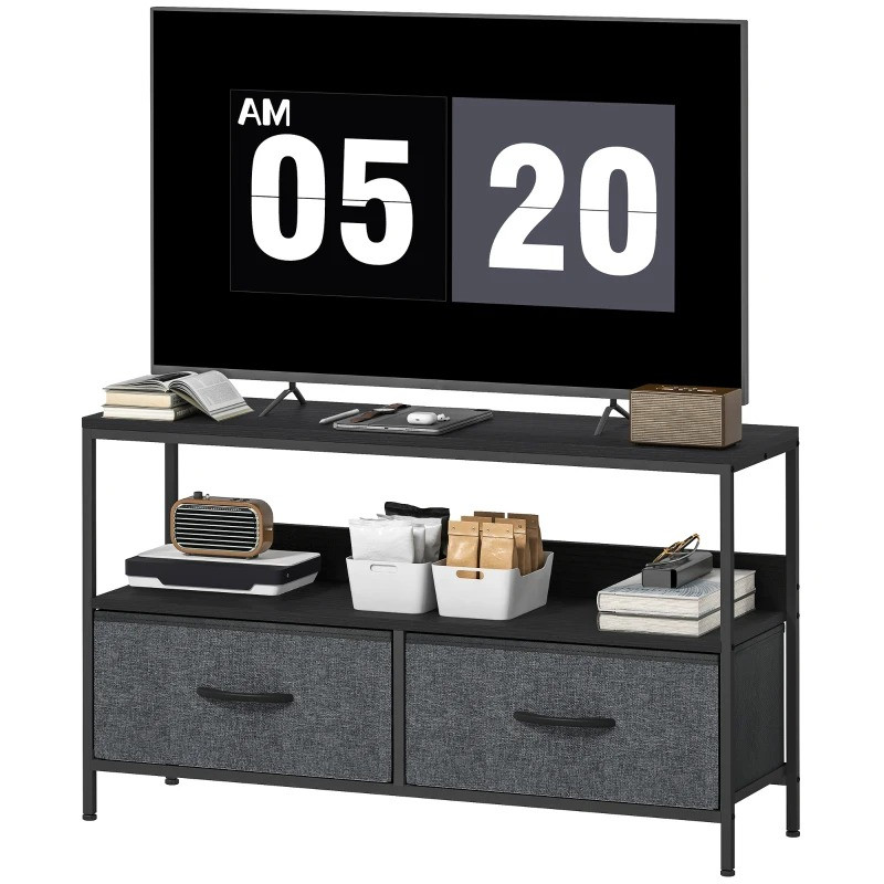 TV stolek se 2 výklopnými látkovými zásuvkami a policí 98 x 29 x 56 cm | černý