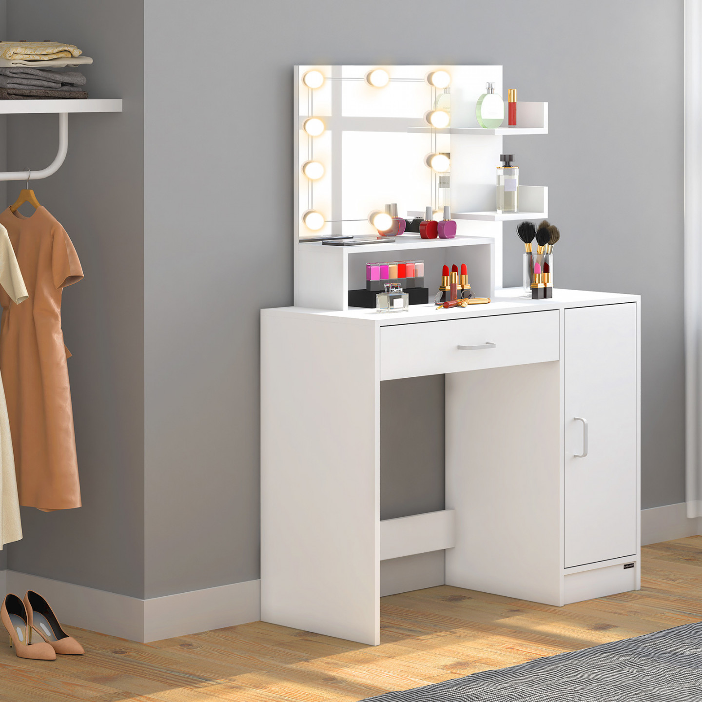 Zásuvka je vybavena sofistikovaným osvětlením , které se zapíná a vypíná pomocí senzoru vzdálenosti . Díky tomu odpadá zdlouhavé hledání, protože máte vždy přehled. Lehce se pohybující kovové kolejnice umožňují snadné otevírání zásuvky. Stylingové produkty nebo parfémy lze vystavit na dvou dalších policích a jedné úložné přihrádce vedle velkého zrcadla .Snadno udržovatelné povrchy toaletního stolku lze v případě znečištění otřít měkkým vlhkým hadříkem.Pro ochranu podlahy jsou na nohy toaletního stolku připevněny chrániče podlahy . Tím se zabrání poškrábání. Toaletní stolek lze rychle a snadno sestavit pomocí přiloženého montážního návodu . Pro ještě větší stabilitu má stolek možnost montáže v zadní části, která umožňuje jeho upevnění ke zdi. Tím se zabrání převrácení.LED lampy jsou stmívatelné v deseti krocích a nabízejí tři režimy svícení : teplá bílá, přirozená bílá nebo bílá. LED lampy lze připojit k napájení