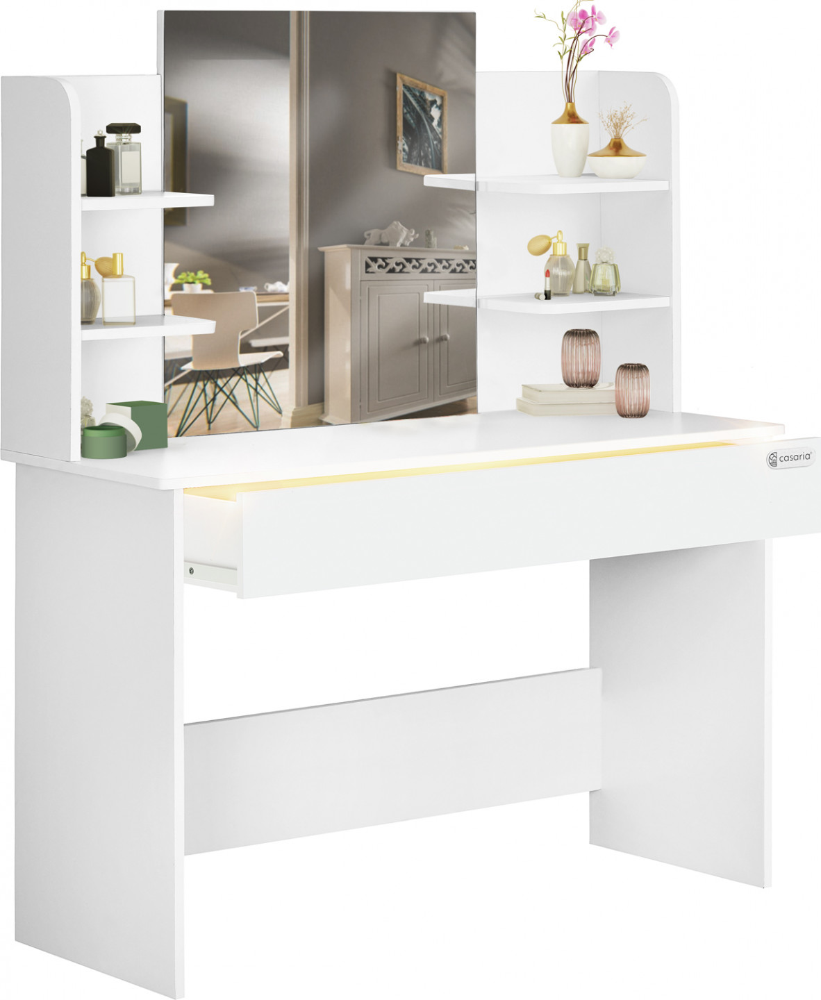 S tímto moderním toaletním stolkem Lucia budete mít vždy po ruce kosmetiku, kartáče na vlasy a parfémy na jednom místě. Krásný a jednoduchý design se hodí do jakéhokoli interiéru, ať už v koupelně nebo ložnici.Umyvadlová skříňka má čtyři malé police vedle velkého zrcadla . Zde si můžete vystavit své oblíbené kosmetické produkty. Velká zásuvka bez úchytek má tři přihrádky, ideální pro uložení šperků a make-upu.Hlavní výhoda: Zásuvka je vybavena osvětlením se senzorem vzdálenosti, které se automaticky zapíná a vypíná při otevření zásuvky a osvětluje vaše poklady. Vysoce kvalitní kovové výsuvy zajišťují obzvláště plynulý a pohodlný pohyb zásuvky.Navrhněte si konzoli přesně podle svých představ a vždy odejděte z domu ve skvělém stavu – do práce, do školy nebo na příští večírek.Stolek má možnost montáže v zadní části a pro větší stabilitu jej lze připevnit na zeď. Snadno udržovatelný toaletní stolek lze v případě znečištění snadno otřít měkkým vlhkým hadříkem. Díky přiloženému montážnímu návodu se toaletní stolek snadno a rychle sestavuje.