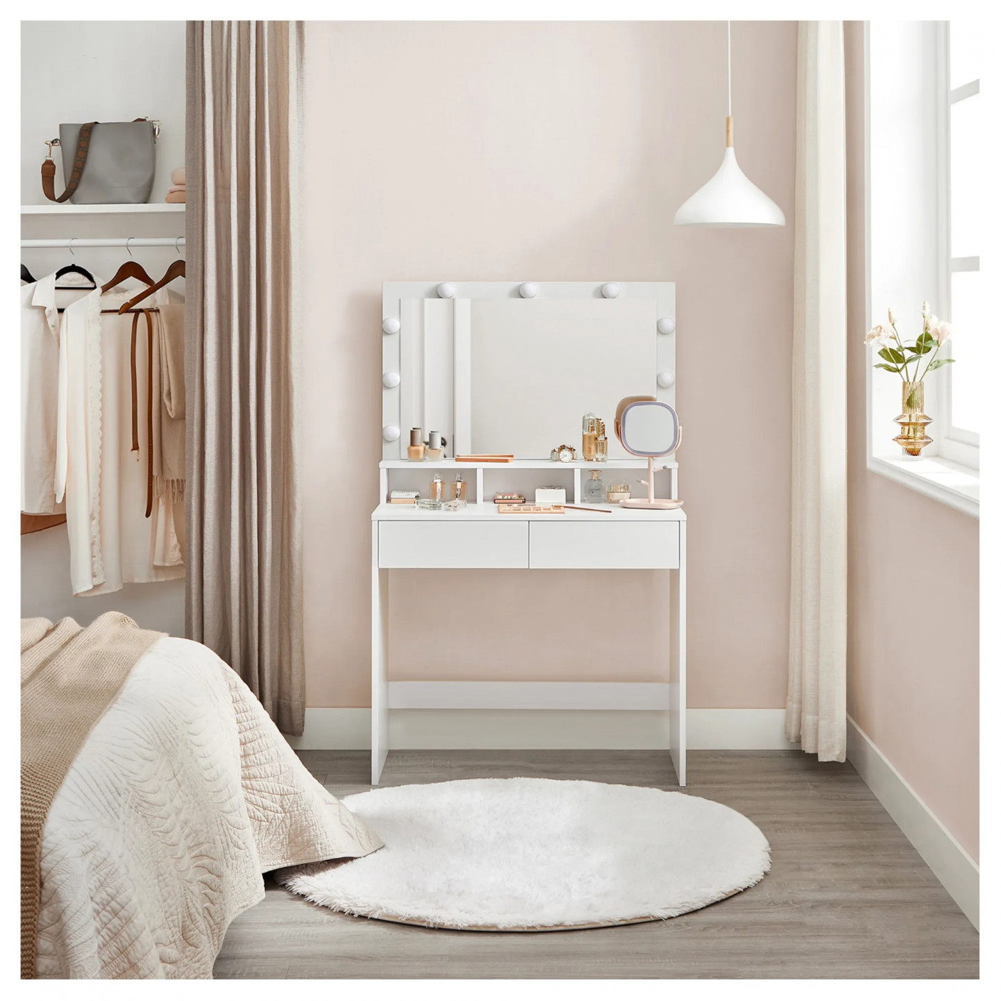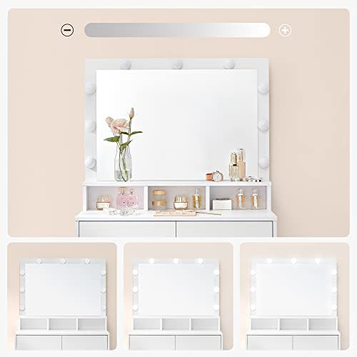 9 stmievateľných žiaroviek tohto toaletného stolíka okolo zrkadla rozžiari vašu tvár.2 veľké zásuvky a 3 otvorené priehradky toaletného stolíka poskytujú dostatok priestoru na make-up a uľahčujú organizáciu kozmetiky.
