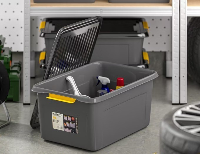 Úložné boxy vnesou pořádek do sklepů, garáží a dílen. Jsou bezpečné pro styk s potravinami a odolné teplotám od -30 °C do +90 °C. Díky tomu jsou ideální pro skladování potravin nebo mražených surovin. Robustní víko na pantech chrání obsah a lze jej buď otevřít, nebo zcela vyjmout. Krabice unesou až 40 kg a pasují do standardních regálů pro vysoké zatížení. Krabice lze stohovat pro úsporu místa a v případě nečinnosti je lze umístit do sebe.
