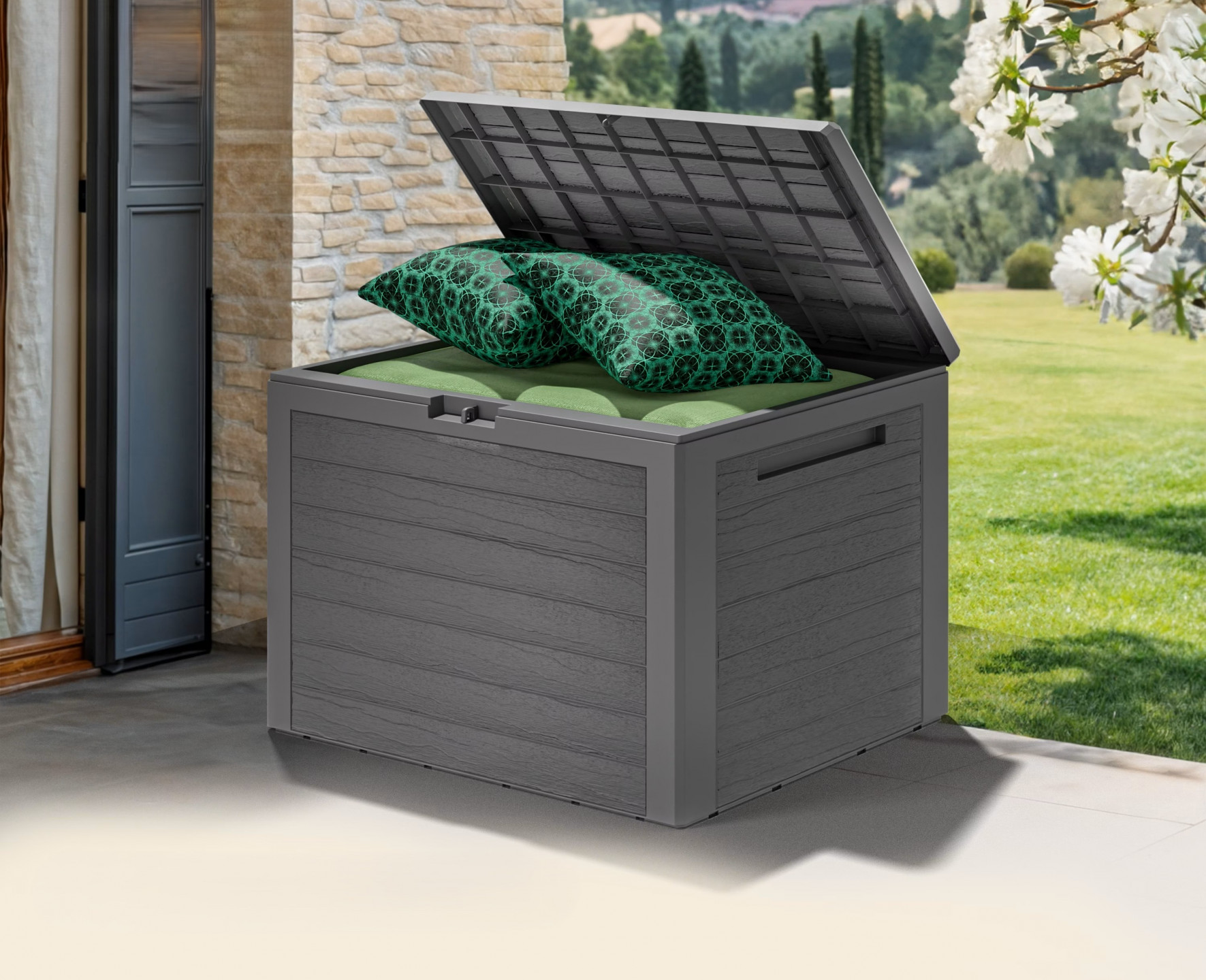 Robustní zahradní box od v moderním dřevěném designu nabízí objem 190 litrů a dostatek místa pro vaše sedáky, polštáře, zahradní doplňky, hračky a mnoho dalšího. Úložný box je vyroben z plastu odolného proti povětrnostním vlivům a má výklopné víko s integrovaným zamykacím mechanismem pro bezpečné uložení. Zapuštěné rukojeti po stranách umožňují snadné umístění a přemístění. Exkluzivní barva truhly je moderní a nadčasová, hodí se k mnoha stylům interiéru a harmonicky zapadne do jakékoli terasy, zahrady nebo balkonu . Truhla je vhodná i pro použití v interiéru. Díky praktickému zacvakávacímu systému lze krabici na polštáře sestavit během chvilky a bez použití nářadí . Jednotlivé díly lze snadno zasunout do sebe.