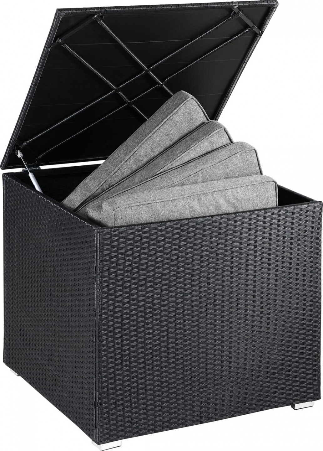 S objemem 318 litrů nabízí robustní box na polštáře dostatek úložného prostoru pro sedáky, polštáře a další zahradní doplňky . Rám z polyratanu odolného vůči povětrnostním vlivům a pozinkované oceli je ideální pro venkovní použití . Povrch zahradního boxu je odolný vůči nečistotám a snadno se čistí.Celoplošná vnitřní podšívka z polyesteru se zapínáním na suchý zip s nepromokavou vrstvou a zipem s velkým otvorem poskytuje ideální ochranu vašich polštářů před vlhkostí a hmyzem.Robustní víko je vyztuženo polykarbonátovou deskou, takže jej můžete využít jako praktický úložný prostor. Víko truhly je také vybaveno plynovou pružinou pro pohodlné otevírání a zavírání. Vhodné rozšíření k lehátku a ideální na balkon, zahradu nebo terasu.
