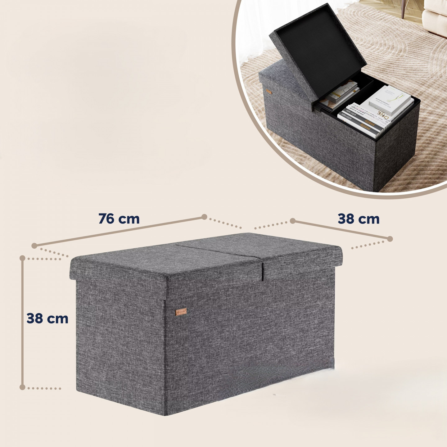 Rám lavice je vyroben z masivní MDF dřevovláknité desky. Extra pevné víko lze otevřít z obou stran. Můžete tak rychle vyjmout nebo vložit předměty, aniž byste museli víko zcela sundat. Vnitřek úložného boxu lze oddělit dvěma přepážkami. To také dává taburetu velmi vysokou stabilitu. Povrch stoličky je polstrovaný pěnou s vysokou hustotou , což zajišťuje pohodlné sezení. Dno uvnitř stoličky chrání obsah před vlhkostí a povrch se velmi snadno udržuje. S úložným prostorem o objemu 100 litrů je tato stolička velmi prostorným a praktickým úložným boxem na hračky, časopisy, CD/DVD, knihy, oblečení a mnoho dalšího.