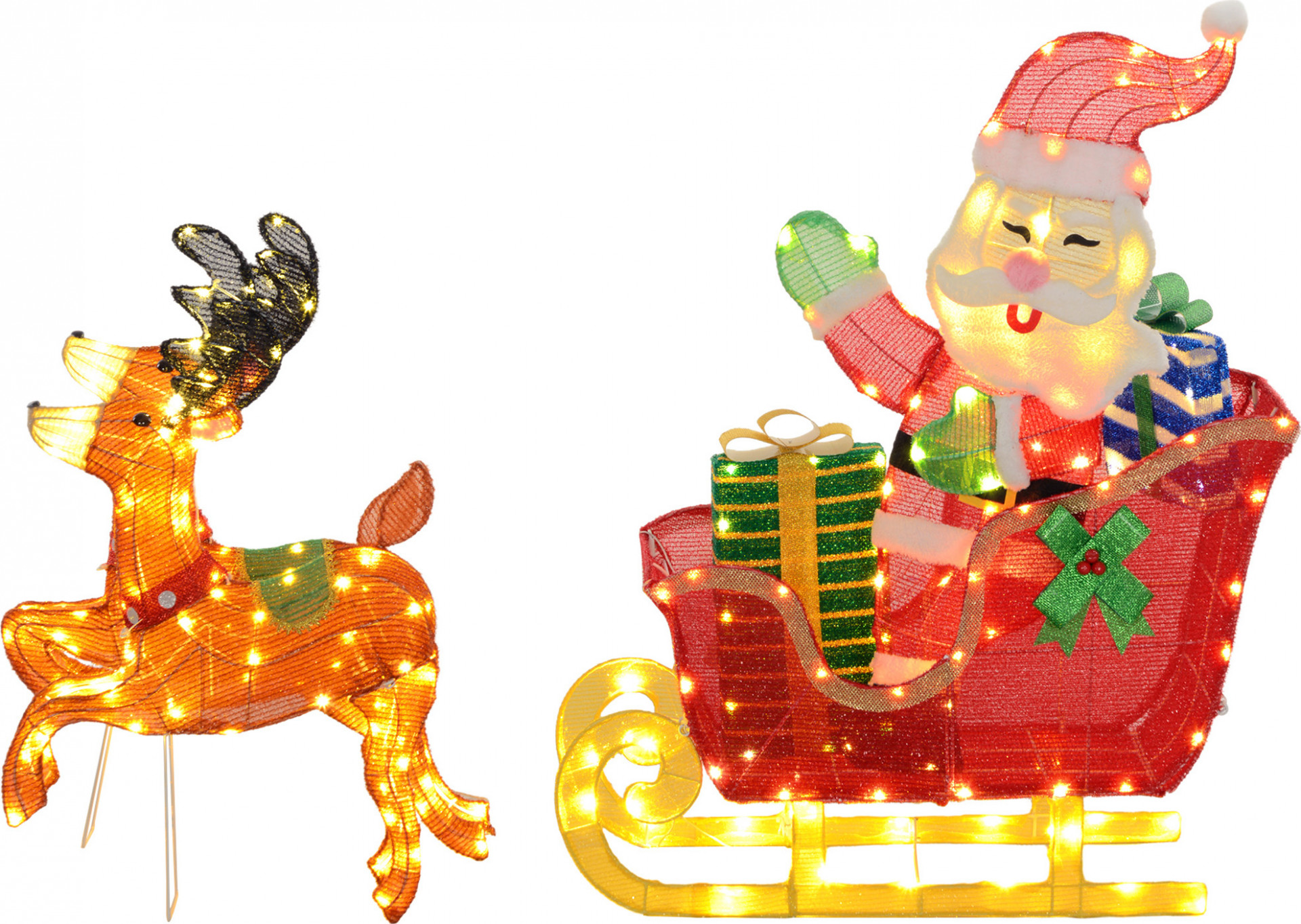 Proměňte svou zahradu v zimní říši divů díky zářivým vánočním dekoracím. Naše slavnostní sada sobů a saní, krásně a pestře zdobená, nesmírně vylepší vaši vánoční výzdobu. Teplá bílá LED světla vánočního osvětlení vytvářejí v noci útulnou atmosféru. Ideální do interiéru i exteriéru, kde rozzáří sváteční období.
