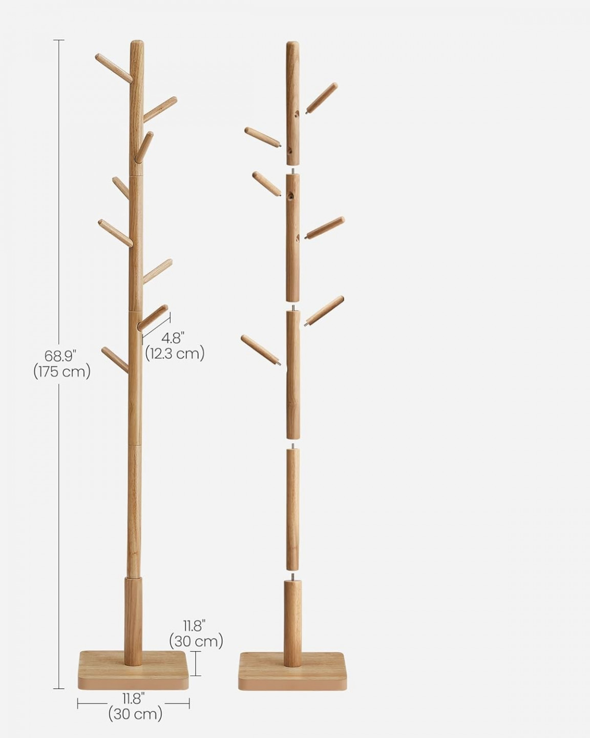 Tento věšák z masivního dřeva je odolný po mnoho let. S 8 zaoblenými kolíčky v různých výškách nabízí tento věšák na kabáty dostatečný prostor pro kabáty a tašky, aby se zabránilo překrývání. 3dílný design vám umožňuje rozhodnout o výšce věšáku.