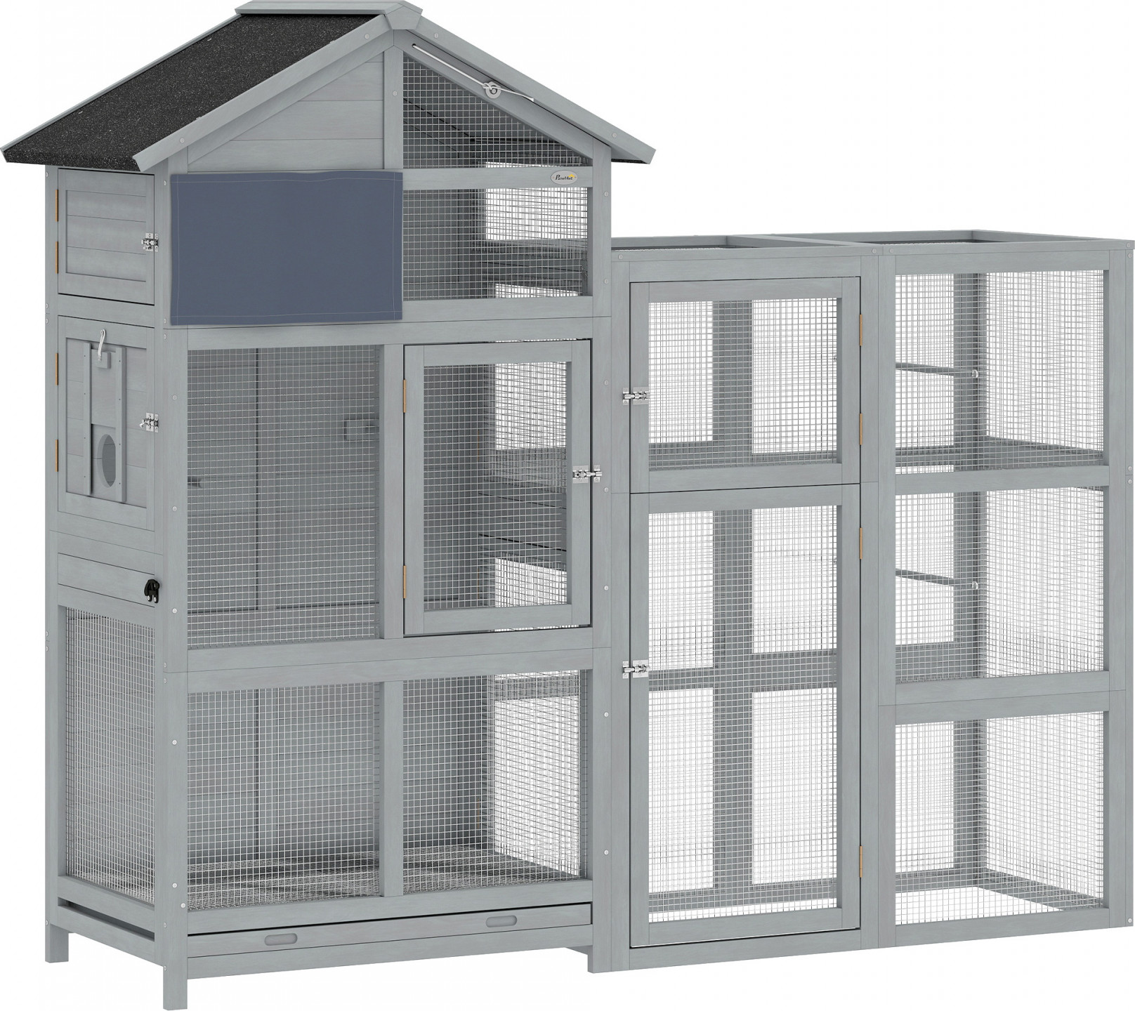 - Asfaltová střecha odolná proti povětrnostním vlivům udržuje vnitřek voliéry v suchu za silného deště nebo intenzivního slunečního svitu