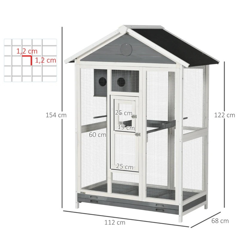 Ptačí klec s výsuvným podstavcem, 112 x 68 x 154 cm | bílá + šedá