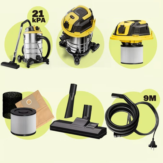 Mokro-suchý vysavač MONZANA® odstraňuje suché nečistoty a kapaliny s maximálním výkonem 2 200 wattů a sacím výkonem 18 kPa. S objemem 30 litrů lze vysavač používat pro dlouhodobé nepřetržité čištění. Díky kolečkům otočným o 360° a poloměru pohybu 9 metrů lze bez námahy dosáhnout na velké plochy .