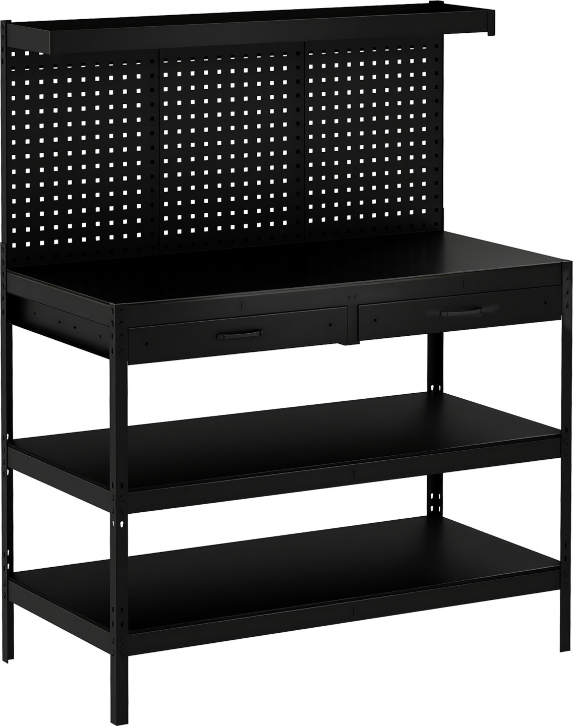 Pracovní stůl promění chaotickou garáž v tvůrčí ráj. Neustálé hledání nářadí a stabilní pracovní plochy je minulostí a nedokončené projekty už nejsou zdrojem frustrace. Tento pracovní stůl v sobě integruje perforovanou ocelovou stěnu a police, díky kterým bude vše uspořádáno na jednom místě. Robustní ocelový rám unese až 272 kg a poskytne vám bezpečí a prostor, který potřebujete k tomu, abyste mohli bez obav a s lehkostí realizovat své nápady.
