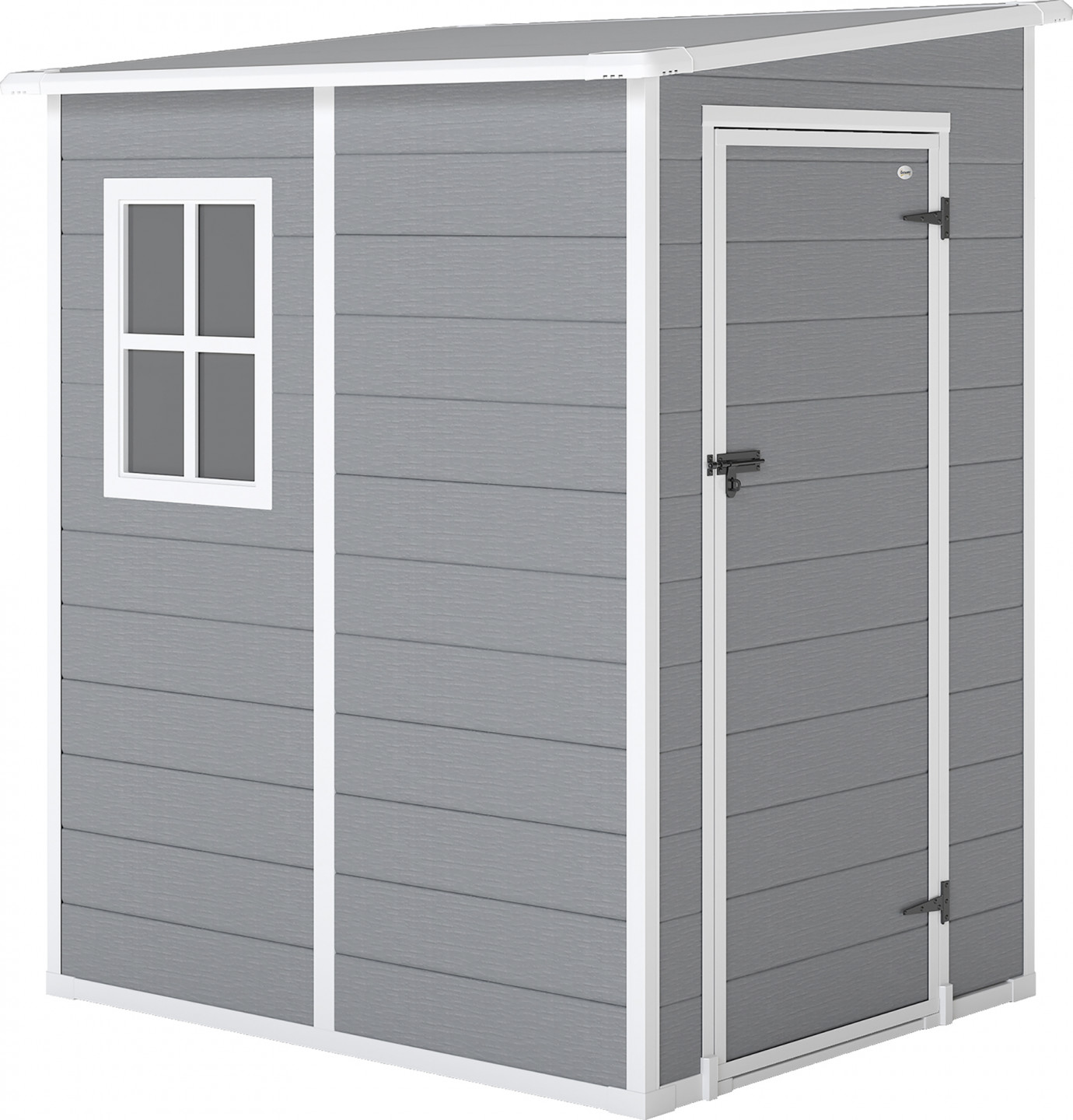 - Robustní hliníkový okraj a plastový rám zahradního domku zajišťují pevné jádro, šikmá střecha zabraňuje hromadění vody.