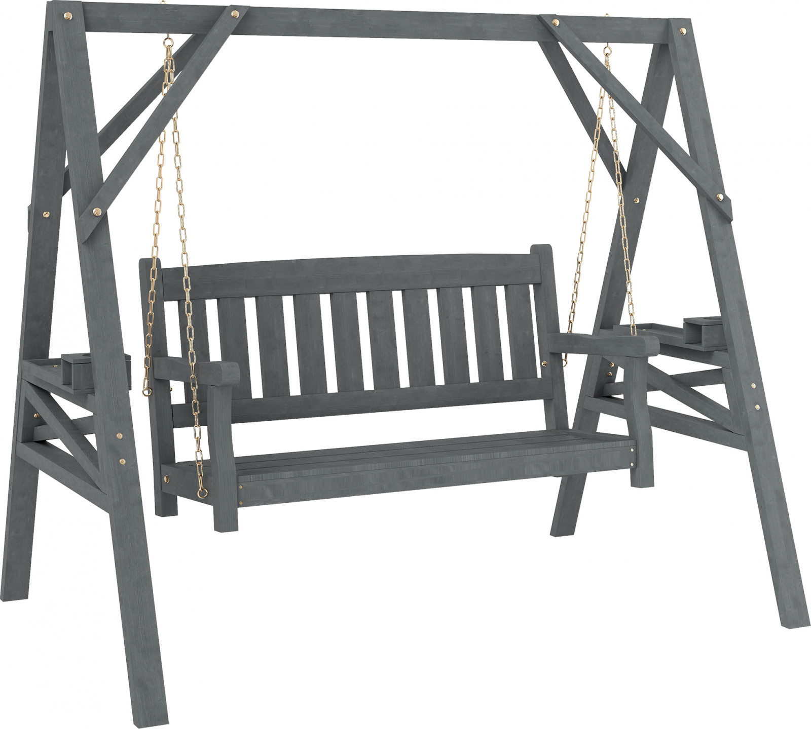 Relaxujte s dřevěným houpacím křeslem pro 2 osoby. Ergonomicky navržené křeslo má nakloněné opěradlo, široký sedák, područky a robustní konstrukci ve tvaru písmene A. S bočními policemi a držáky na nápoje je ideální k bazénu, na terasu nebo zahradu - dokonalý doplněk pro chvíle odpočinku venku!