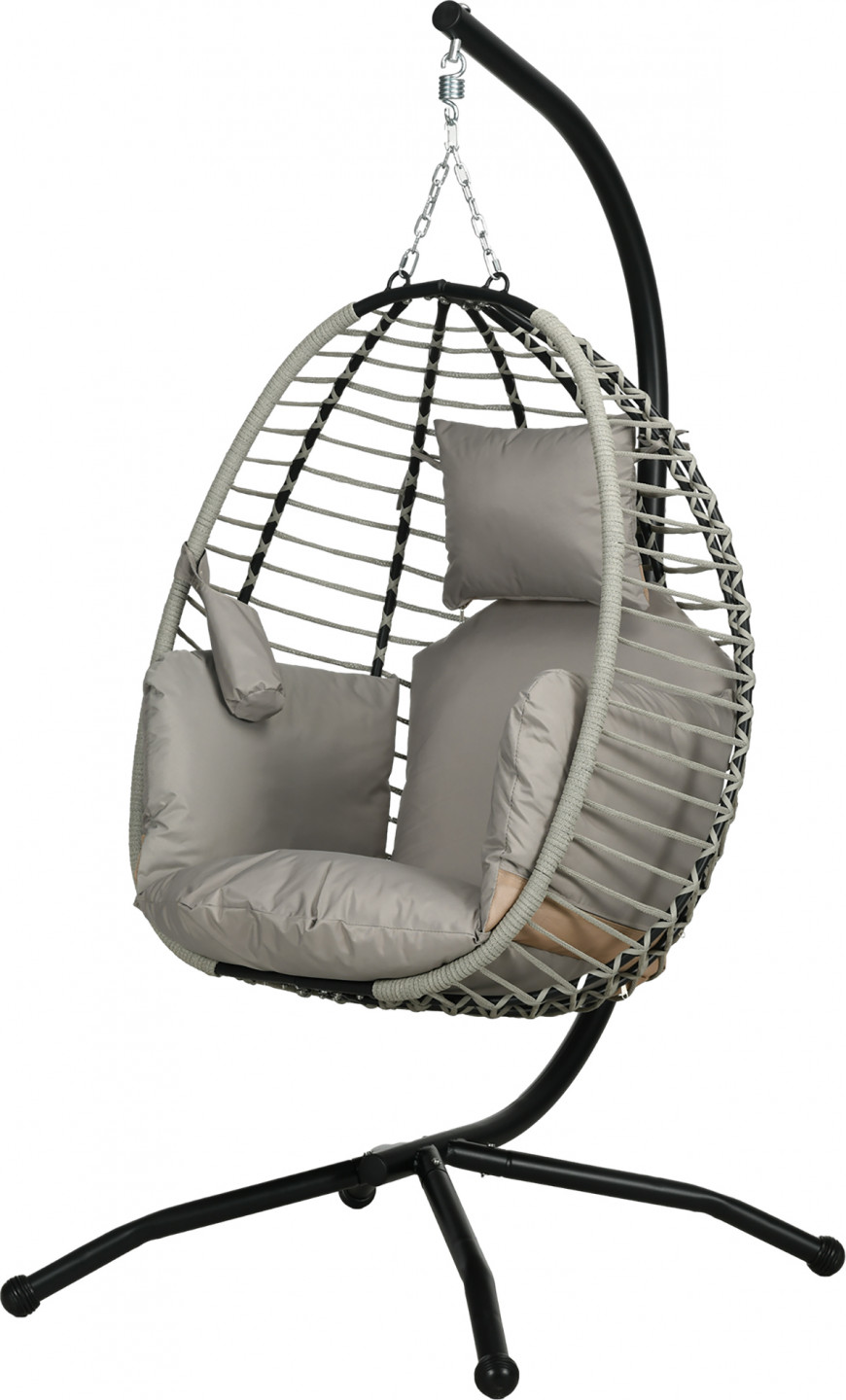 Zakřivené opěradlo, prostorné sedadlo a silný sedák zajišťují pohodlné sezení. Závěsné křeslo s rámem má robustní ocelový rám, který unese až 120 kg. Díky skládacímu koši na sedadlo lze křeslo prostorově úsporně a prakticky uložit. Důmyslný vzor koše na sedák zajišťuje propustnost vzduchu a slouží jako vkusný doplněk pro oči.