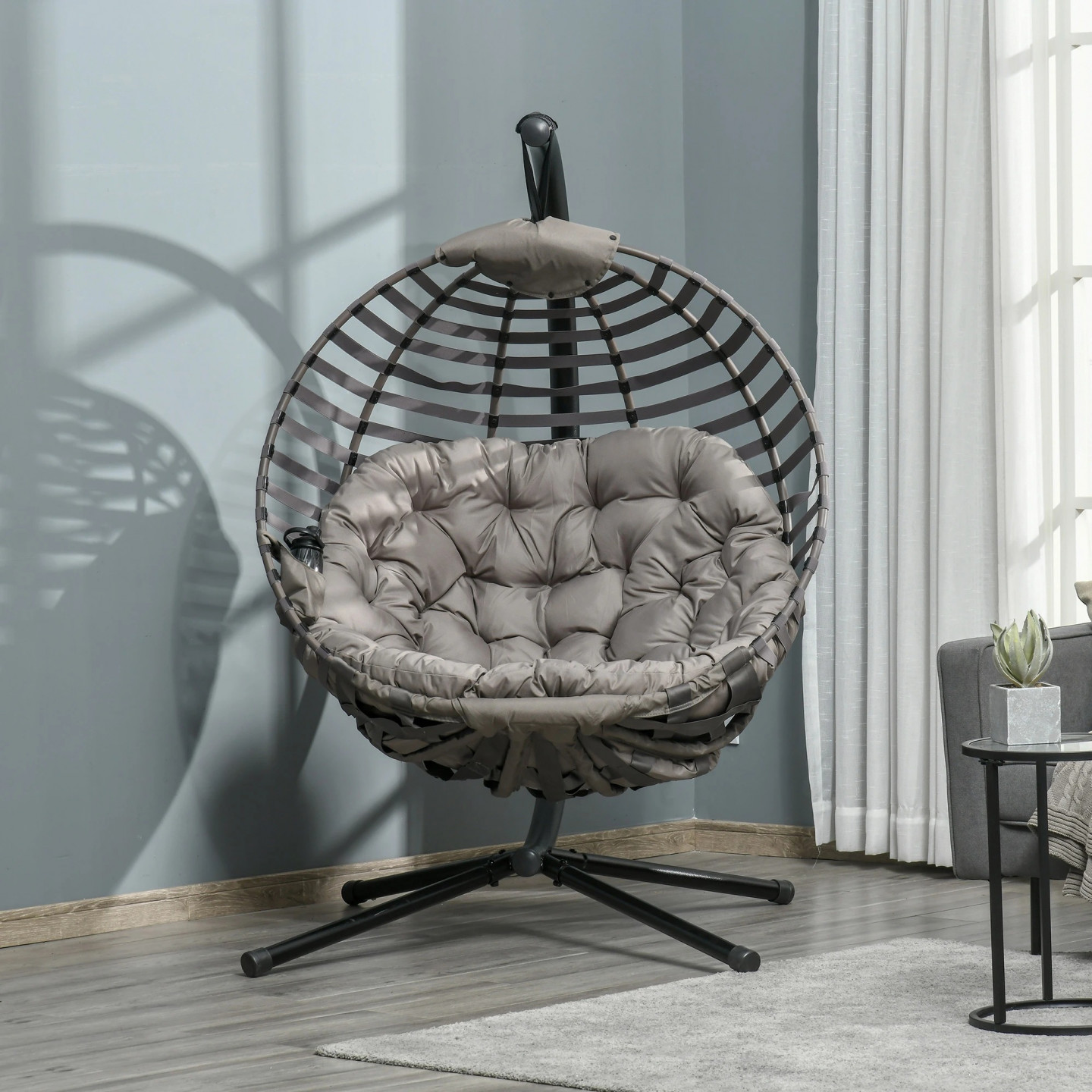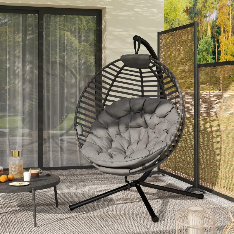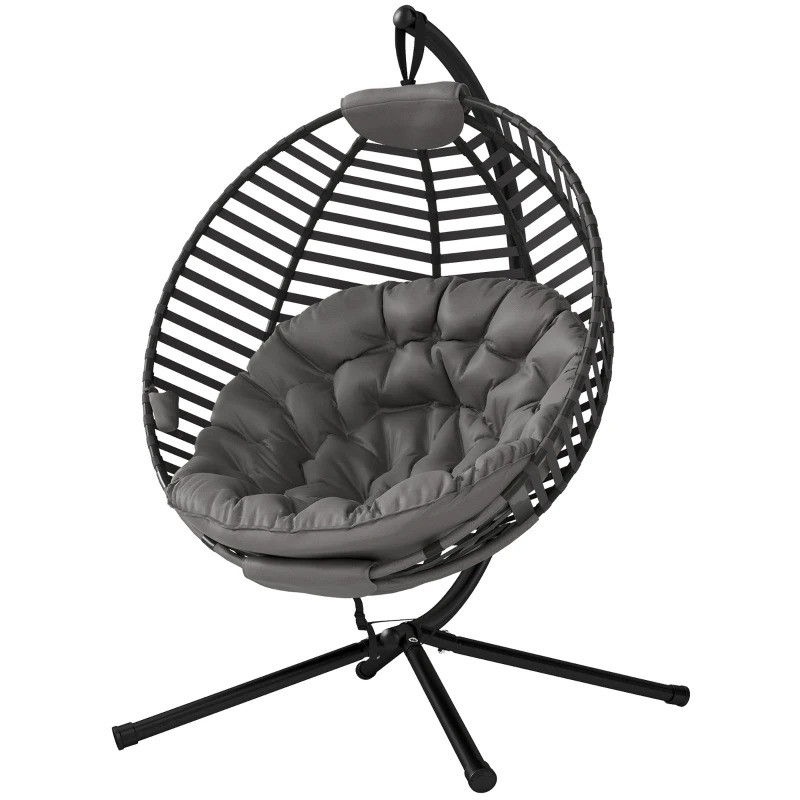 V tomto závěsném křesle strávíte den, jako byste se procházeli po oblacích! Zakřivené opěradlo, prostorný sedák a měkký polštář nabízejí mimořádně pohodlné posezení. Rám je vyroben z oceli a unese až 120 kg, takže jej můžete bez obav používat. Skládací koš na sedadlo umožňuje úsporu místa a pohodlné skladování. Zkrášlete svůj vnitřní nebo venkovní prostor tímto nápadným designovým křeslem.