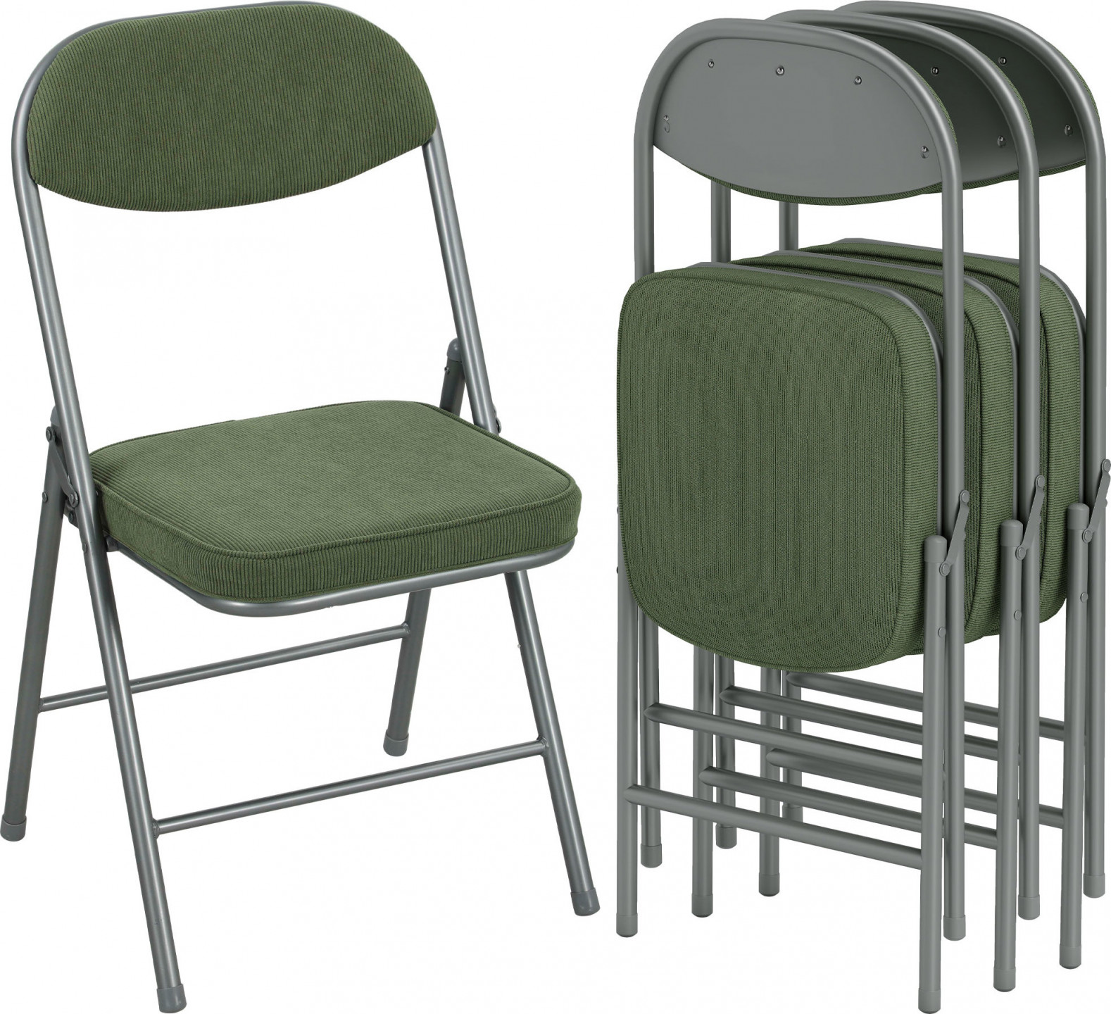 Objevte čtyři skládací židle z měkkého žebrovaného veluru a pěnového polstrování, které jsou ideální pro stolování, práci nebo další sezení. Robustní ocelový rám pro nosnost až 120 kg. Snadné skládání a skladování bez nářadí a námahy.