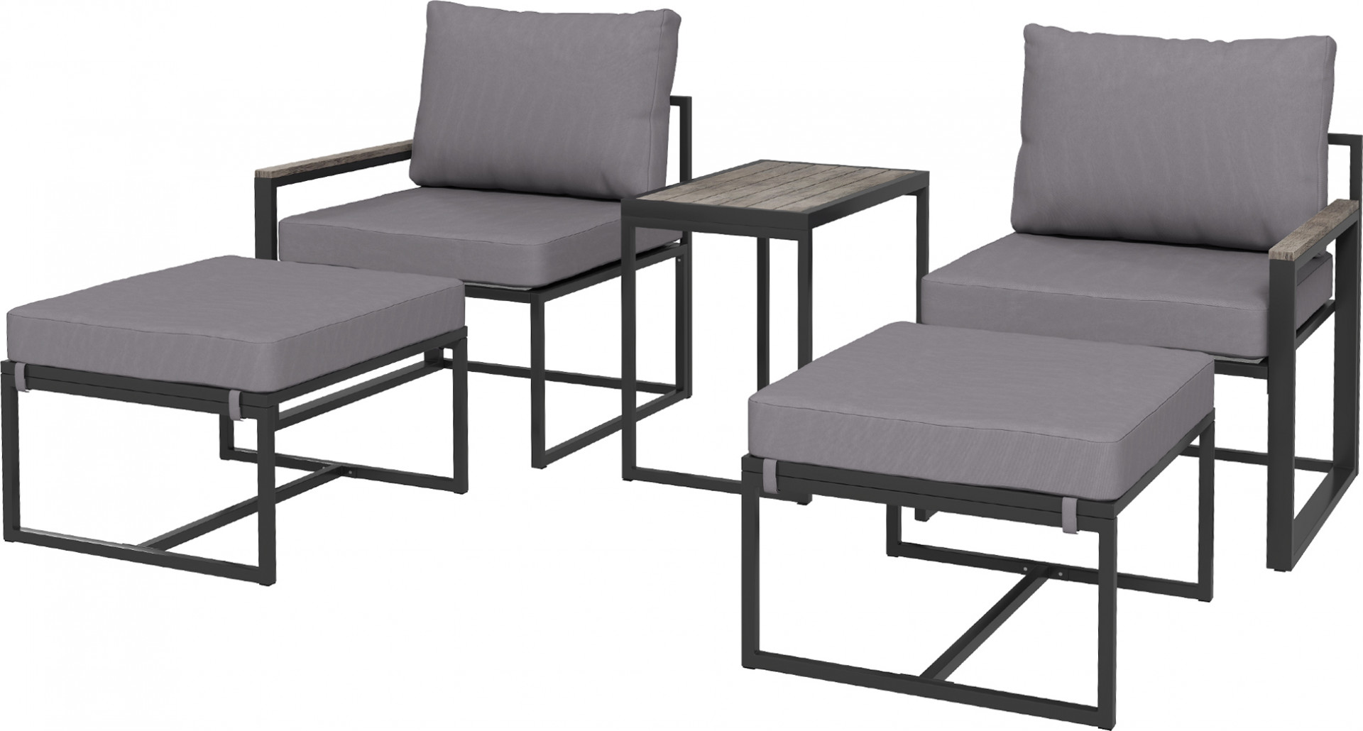 • Pětidílná sada: obsahuje dvě křesla, dvě podnožky a odpovídající konferenční stolek.