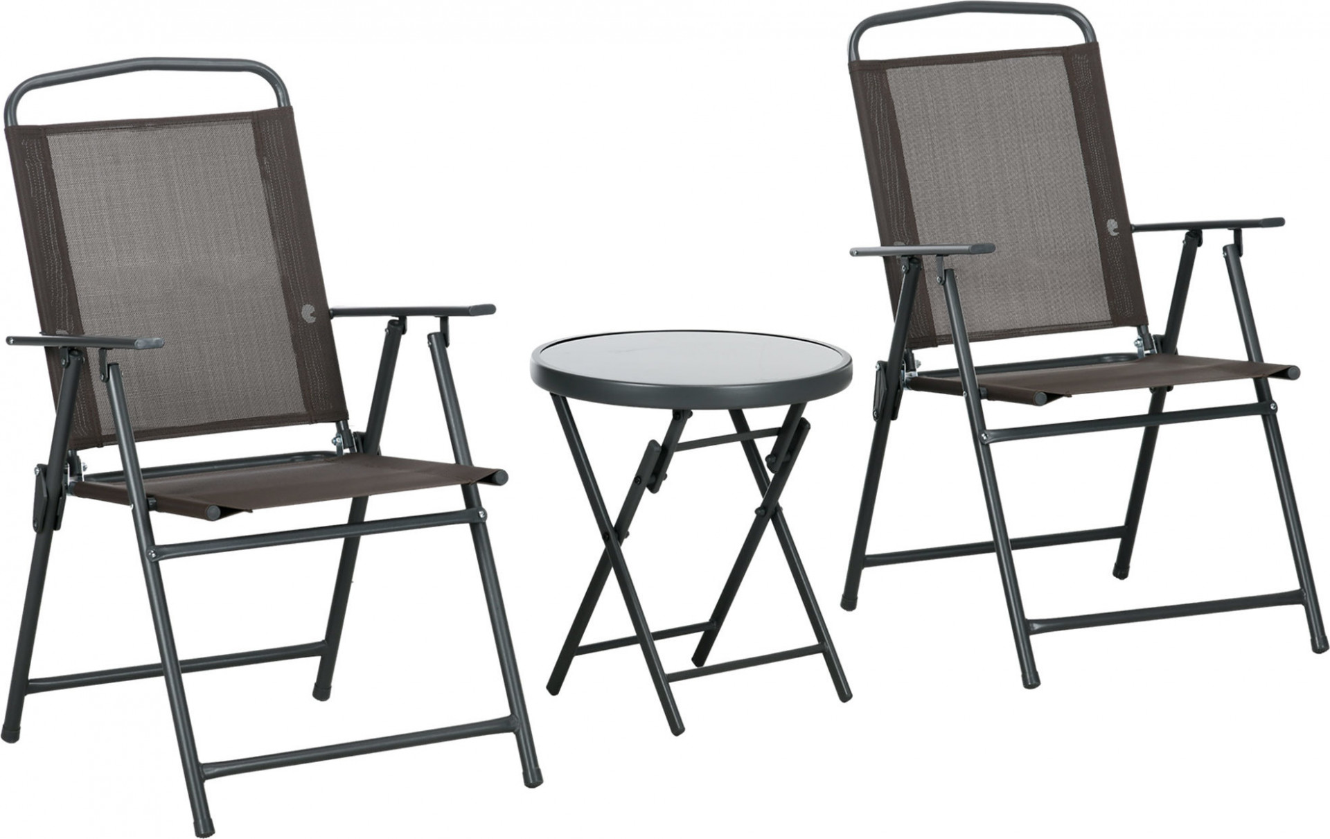 Třídílná kovová sada zahradního nábytku se skládá z konferenčního stolku s deskou z tvrzeného skla a dvou skládacích židlí s područkami. Stůl a židle bistro setu jsou vyrobeny z kovového rámu z práškově lakovaným povrchem, takže jsou stabilní a robustní. Díky skládacímu provedení sady nábytku se stůl a židle snadno skladují a přepravují.