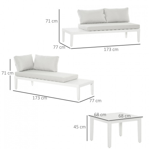 Už nikdy se nemusíte obávat omezeného počtu míst k sezení ve Vašem venkovním prostoru! Naše třídílná sada nábytku se skládá z pohovky, lehátka a konferenčního stolku a nabízí dostatek prostoru pro venkovní konverzaci s hosty. Díky hliníkovému rámu je tato souprava odolná a robustní pro spolehlivé používání. Tato stylová a funkční sedací souprava je skvělým doplňkem terasy, zahrady nebo balkonu.