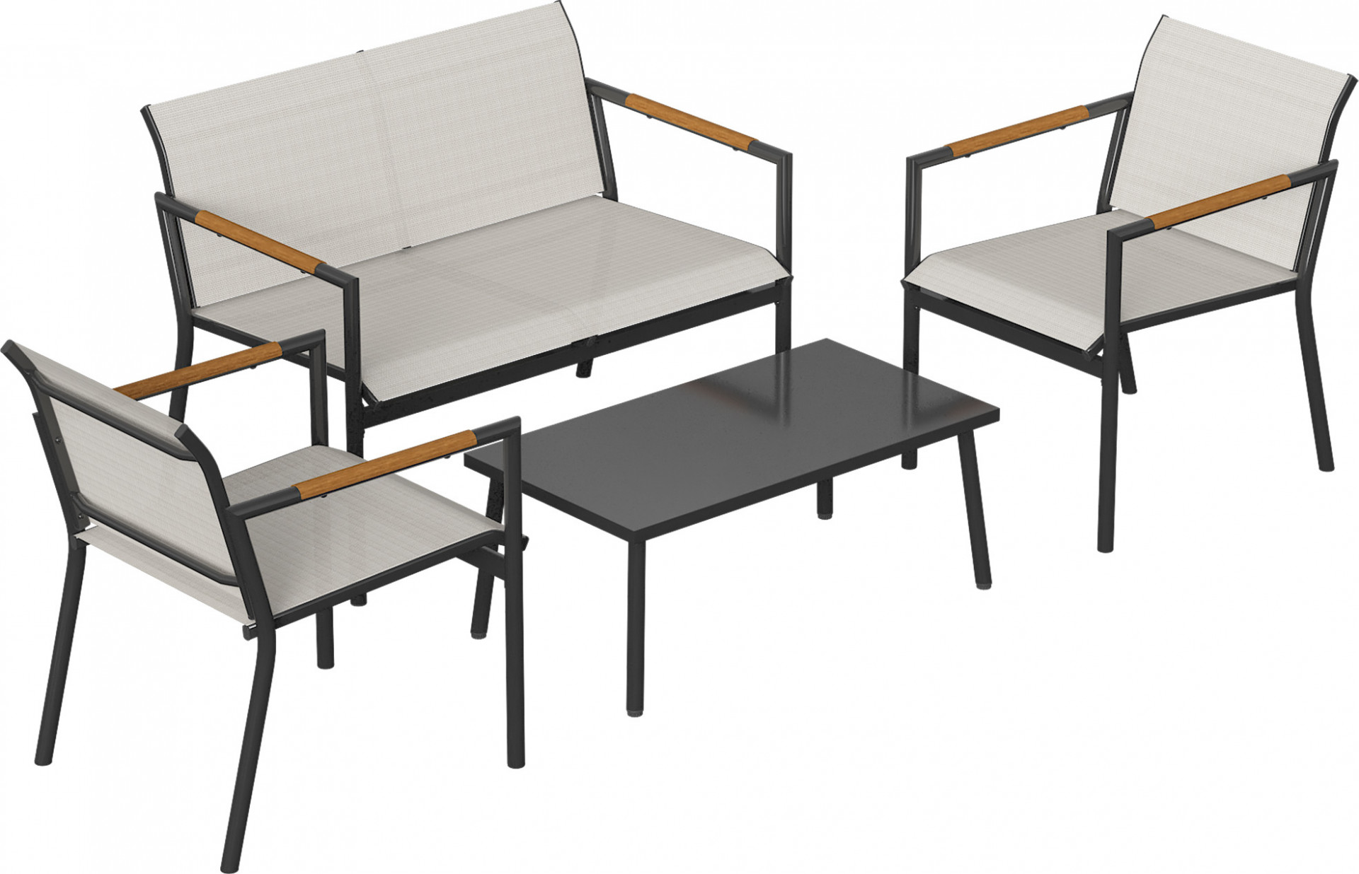 Zažijte chvíle odpočinku venku se čtyřdílnou sadou zahradního nábytku. Dvoumístná pohovka a křesla nabízejí prodyšné síťované sezení pro chladné a suché pohodlí. Robustní kovový rám s práškovým nástřikem a detaily ve vzhledu dřeva dodává eleganci, zatímco stůl s kovovou deskou uchovává občerstvení a nápoje po ruce, takže si můžete bez obav užívat čas strávený venku.