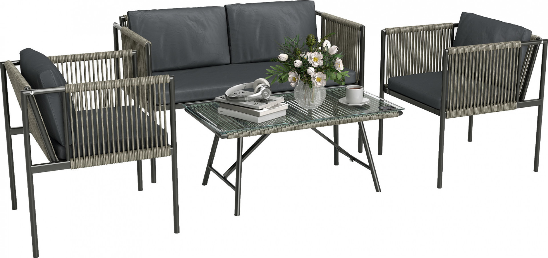 - Materiál: ocel, PE ratan, polyester, tvrzené sklo, pěna