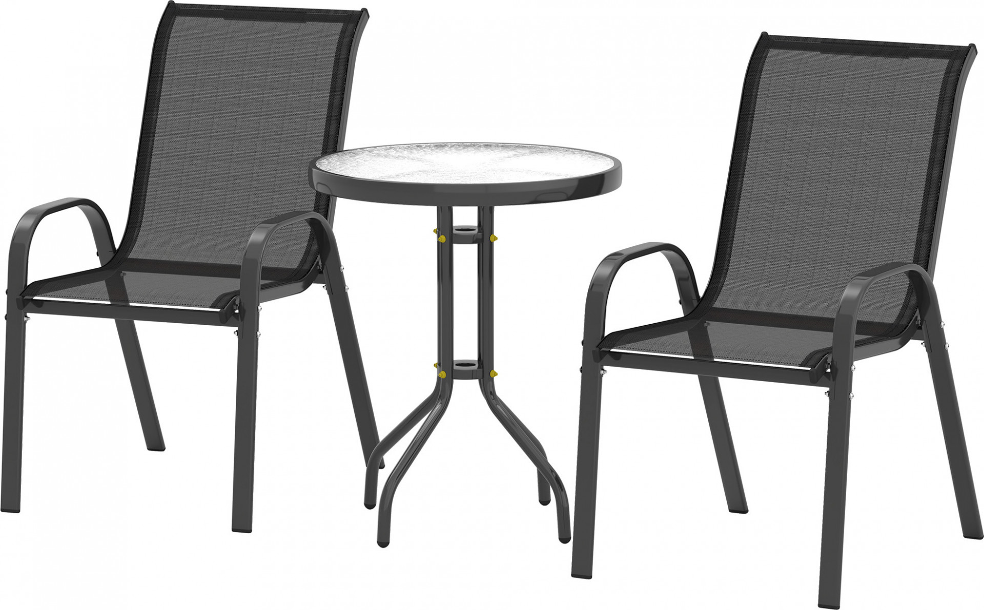 Oživte svůj venkovní prostor venkovním zahradním stolem se židlemi, který je ideální pro malé prostory. Obsahuje dvě stohovatelná křesla, kulatou skleněnou desku stolu, robustní ocelovou konstrukci. Síťované sedadlo, nakloněné opěradlo, zakřivené područky pro optimální pohodlí. Ideální pro odpočinek, zábavu a obdivování západu slunce.