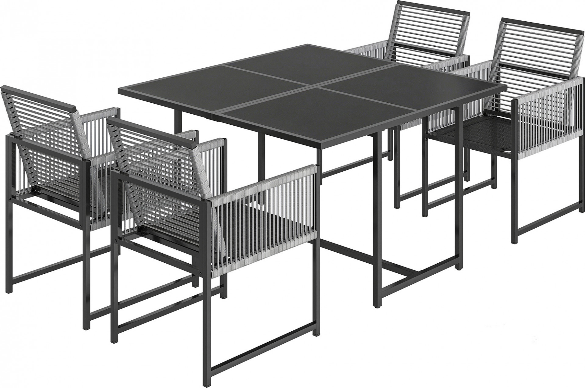 Vytvořte si na zahradě útulné místo k setkávání s tímto venkovním jídelním setem. Díky sklopným opěradlům lze židle uložit pod stůl a ušetřit tak místo. Práškově lakovaná ocel zajišťuje stabilitu zahradního setu, zatímco bavlněné provazy odolné proti UV záření dodávají moderní styl. Stůl s hedvábným potiskem z tvrzeného skla nabízí elegantní vzhled. Užijte si zahradní nábytek při každé příležitosti.