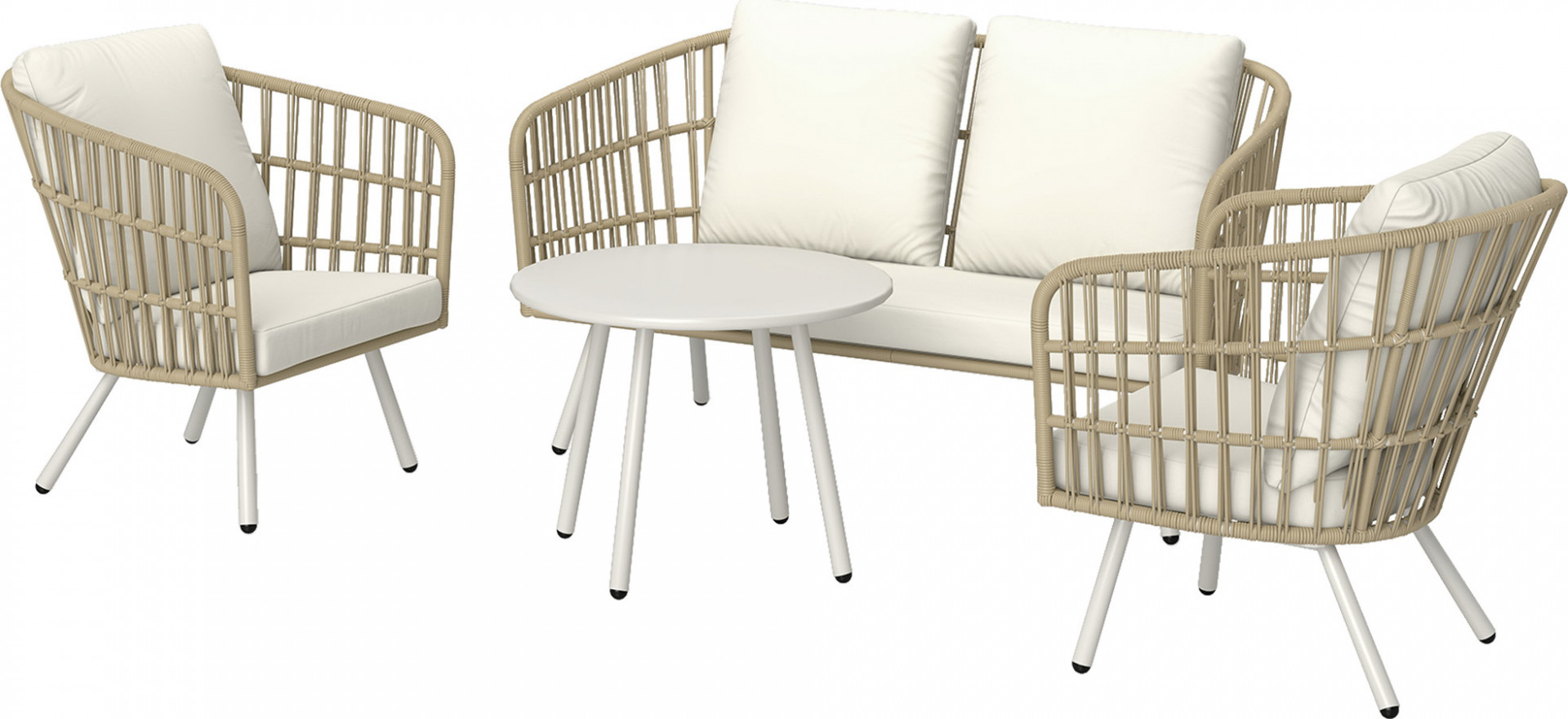 - Práškově lakovaný ocelový rám polyratanové sedací soupravy zabalený do kulatého PE ratanu odolného proti UV záření a povětrnostním vlivům
