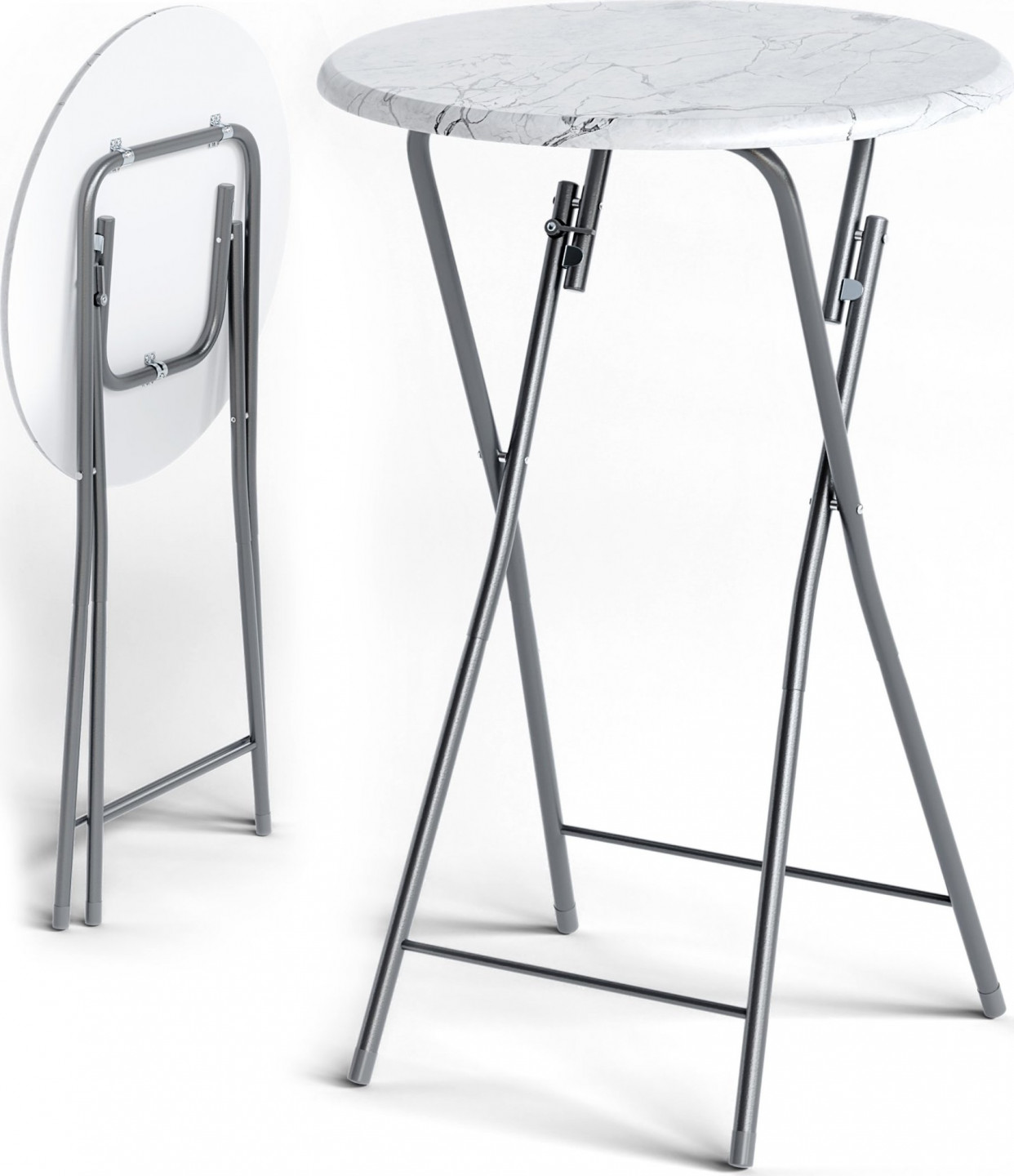 Skládací barový stůl v mramorovém vzhledu se snadno udržovatelnou MDF deskou a robustním kovovým rámem je ideální pro každou zvláštní příležitost. Praktický stůl na stání lze v několika jednoduchých krocích rychle a snadno sestavit nebo složit pro úsporu místa. Protiskluzové a ochranné plastové nožičky umožňují používat stůl uvnitř i venku. Skládací zámek zabraňuje náhodnému zhroucení stolu. Ideální pro mnoho příležitostí, ať už se jedná o narozeninové oslavy, rodinné oslavy, grilování, svatby, zahradní slavnosti, veletrhy nebo jiné akce!