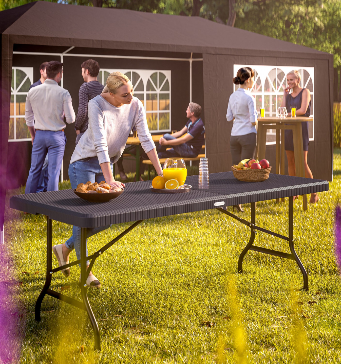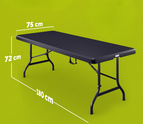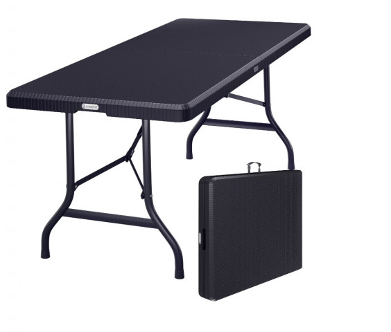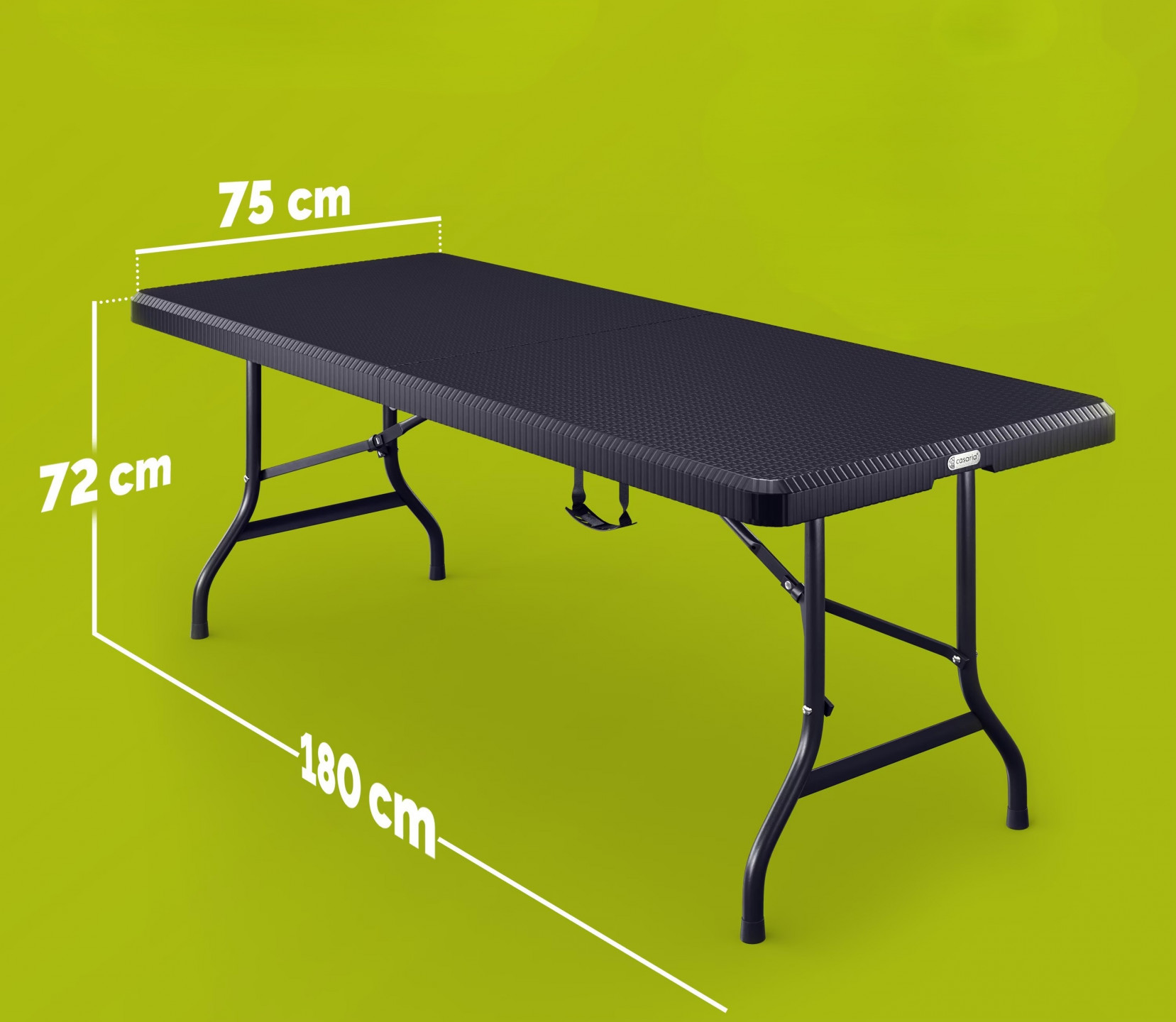 Tento skládací stůl o délce 180 cm se dá obzvláště rychle a snadno sestavit. Naprosto ideální pro příští oslavu narozenin nebo společenskou událost. Spousta místa na pořádné prostírání! Skládací stůl je vyroben z odolného plastu s polyratanem a robustním ocelovým rámem, takže je  robustní a stabilní. Snadno se skládá a přenáší, ideální pro váš příští kempovací výlet! Díky gumové rukojeti , nízké hmotnosti a prostorově úsporné skládací funkci lze stůl s podstavcem snadno a rychle přepravovat a vejde se téměř do každého kufru. Hladký a snadno udržovatelný povrch umožňuje snadné čištění. Veškeré rozlité tekutiny jednoduše setřete vlhkým hadříkem. Stůl lze využít mnoha způsoby v interiéru i exteriéru. Ať už doma, na zahradě, na terase nebo při kempování, na jakékoli oslavě nebo při trvalém používání, jídelní stůl se vyznačuje svou všestranností. Integrované gumové podložky zajistí, že vaše podlaha nebude poškrábána.