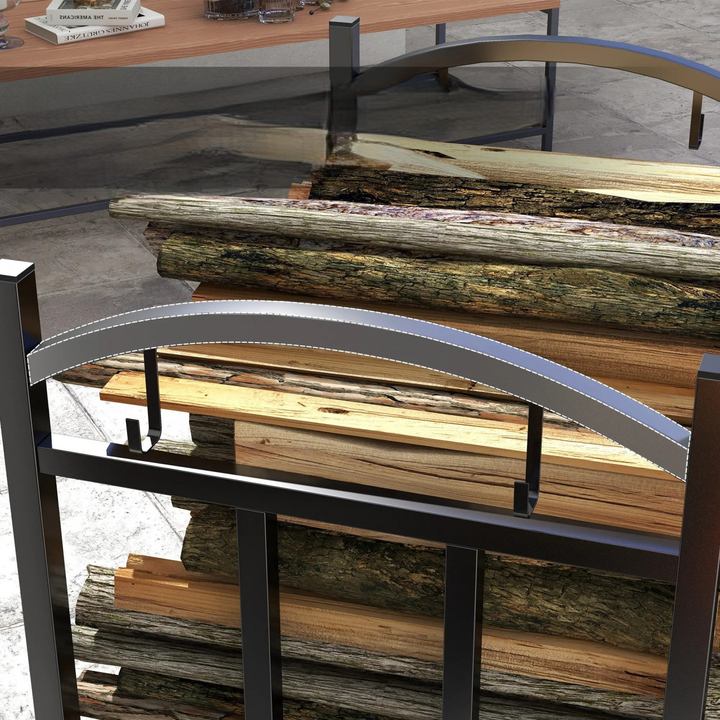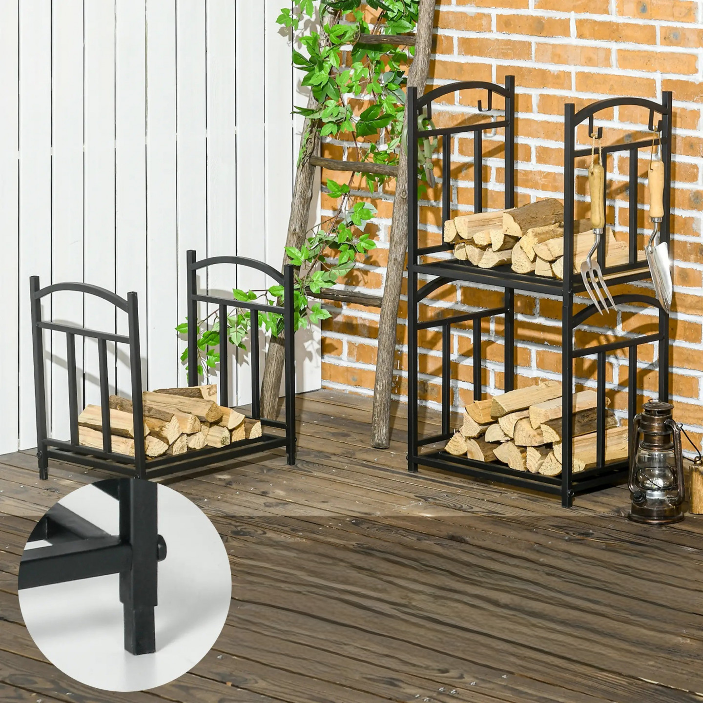 Představujeme praktický stojan na palivové dřevo, který je ideální pro skladování polen v suché a vyvýšené poloze. Tři vnitřní regály na palivové dřevo lze používat jednotlivě nebo ve smontovaném stavu. Každý vnitřní regál na palivové dřevo bezpečně a stabilně pojme 30 kg dřeva. Díky háčkům připevněným na boční straně rámu je po ruce příslušenství, jako je koště, pohrabáč, lopata a kleště. Užívejte si útulné teplo.
