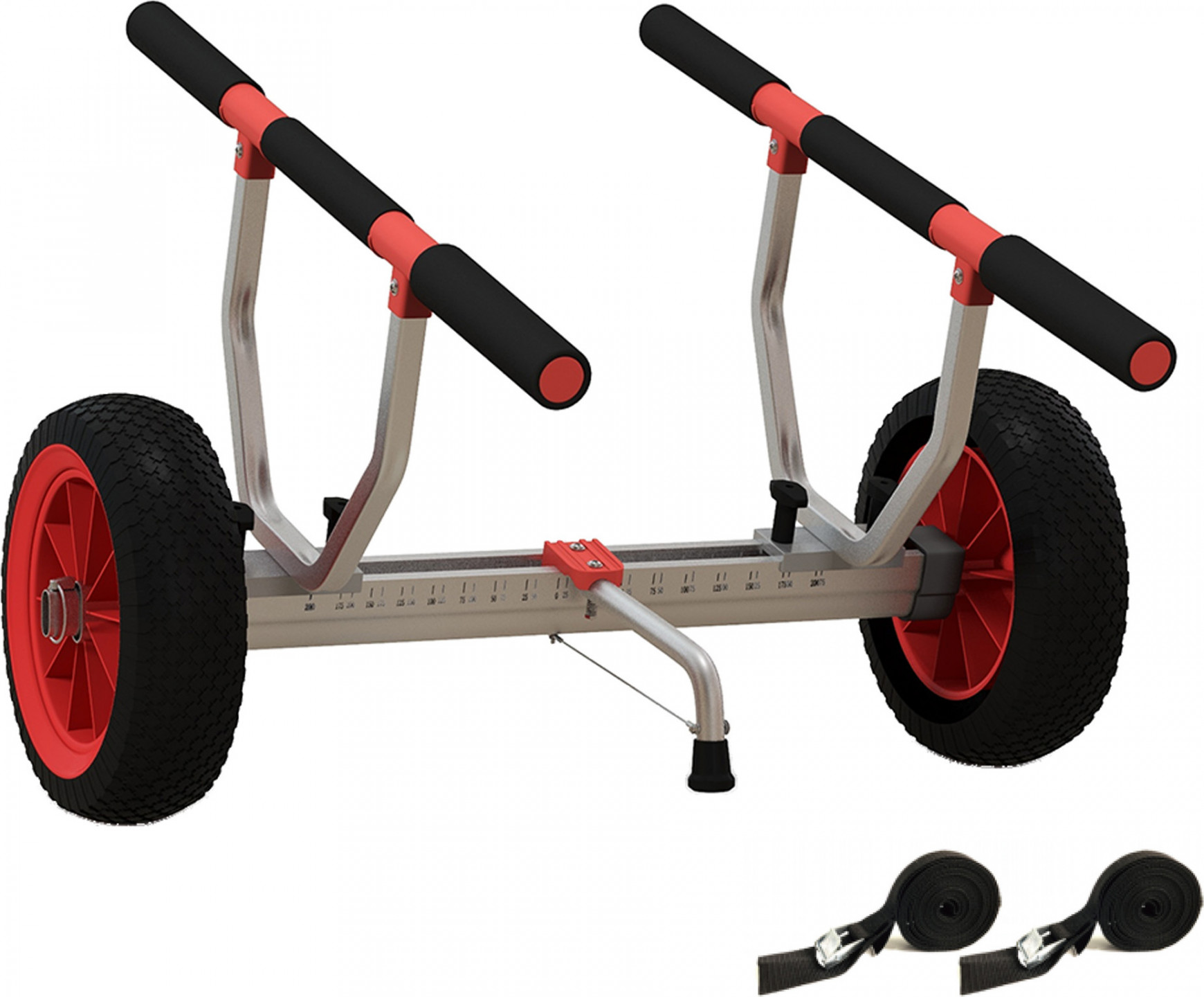 S přepravním vozíkem na kajak můžete snadno přemístit kanoi, kajak nebo pádlo na stojáka. Vozík je vybaven dvěma velkými koly a vysoce kvalitním, ale lehkým hliníkovým rámem, který usnadňuje pohyb po všech površích (od země přes písek až po trávu).