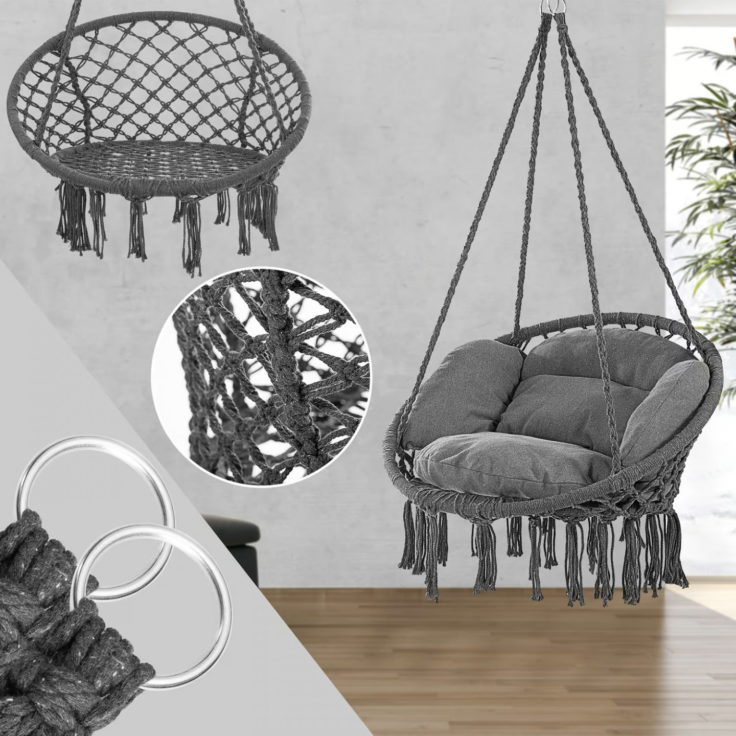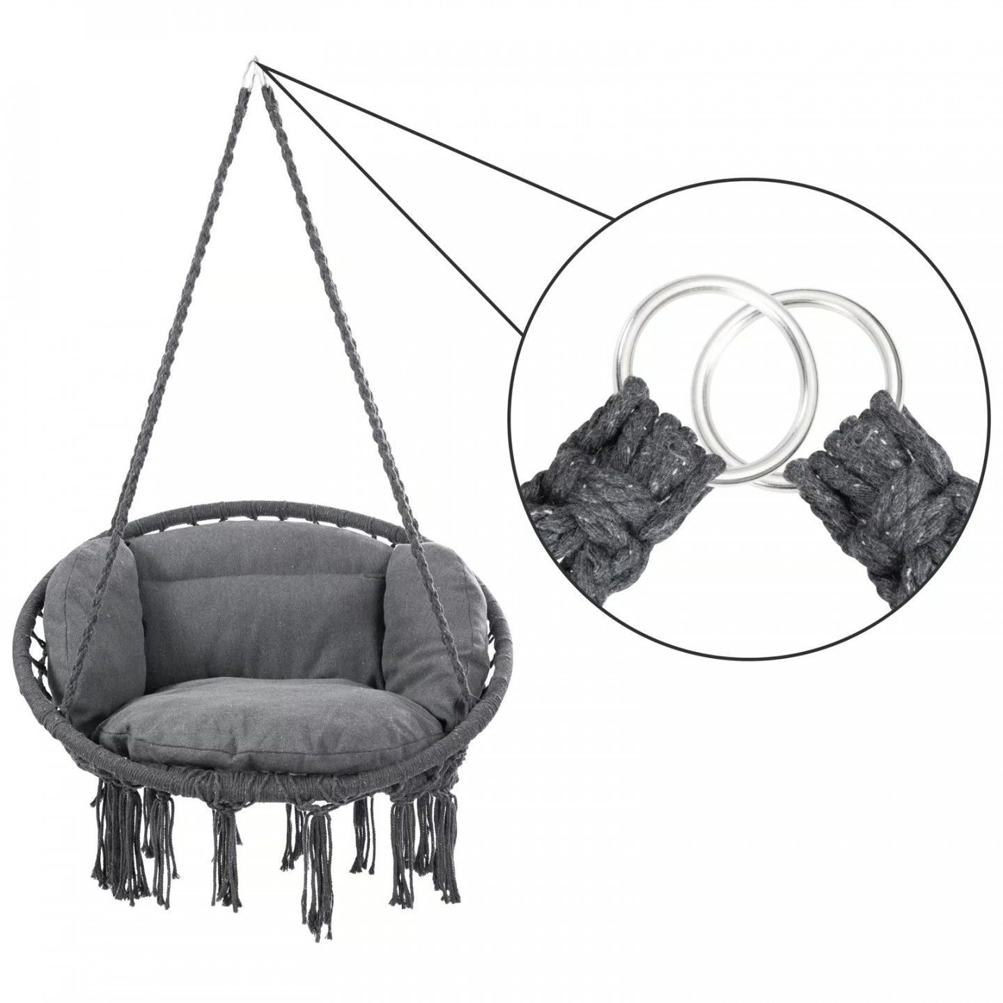 Kulaté závěsné křeslo nabízí vynikající pohodlí při sezení díky dvěma polštářům . Křeslo se sedákem o šířce 60 cm je stylovým poutavým prvkem a pohodlné na nošení. Vysoké opěradlo a silná výplň polštářů se přizpůsobí tvaru vašeho těla a poskytují ergonomickou oporu a pohodlí pro vaše záda.Závěsná židle s certifikací GS má robustní pozinkovaný rám a snadno unese zatížení až 150 kg . Díky dvěma masivním kovovým kroužkům lze závěsnou židli individuálně nastavit a otáčet v libovolném směru. Dva pozinkované železné kroužky umožňují samostatné nebo svazkové zavěšení.Košík závěsného křesla je potažen bavlněnou a polyesterovou tkaninou , která slibuje dlouhou životnost. Je také odolný vůči povětrnostním vlivům a snadno se čistí. UV záření, nečistoty ani voda nemohou závěsnému křeslu ublížit.Díky stylové barvě, sofistikované technice vázání makramé a nadčasovému boho designu lze tento všestranný předmět použít k relaxaci uvnitř i venku a je skvělým doplňkem stávajícího zahradního nábytku.