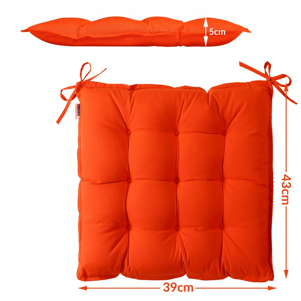 Dodejte svému domovu pohodlí a svěží barvy s touto sadou 6 kvalitních polštářů na židle v energické oranžové barvě. Díky rozměrům 43 × 39 cm a příjemné tloušťce 5 cm nabízejí polštáře vysoký komfort při sezení, ať už u jídelního stolu, v kuchyni, na terase nebo v kanceláři. Měkké polstrování zajišťuje pohodlné a dlouhodobé sezení, zatímco pevný potah garantuje odolnost a snadnou údržbu. Polštáře jsou vybavené praktickými úvazy, díky kterým je snadno připevníte k židli a zabráníte jejich sklouzávání. Sada je ideální pro ty, kteří chtějí zvýšit komfort sezení a zároveň dodat interiéru stylový a barevný prvek.