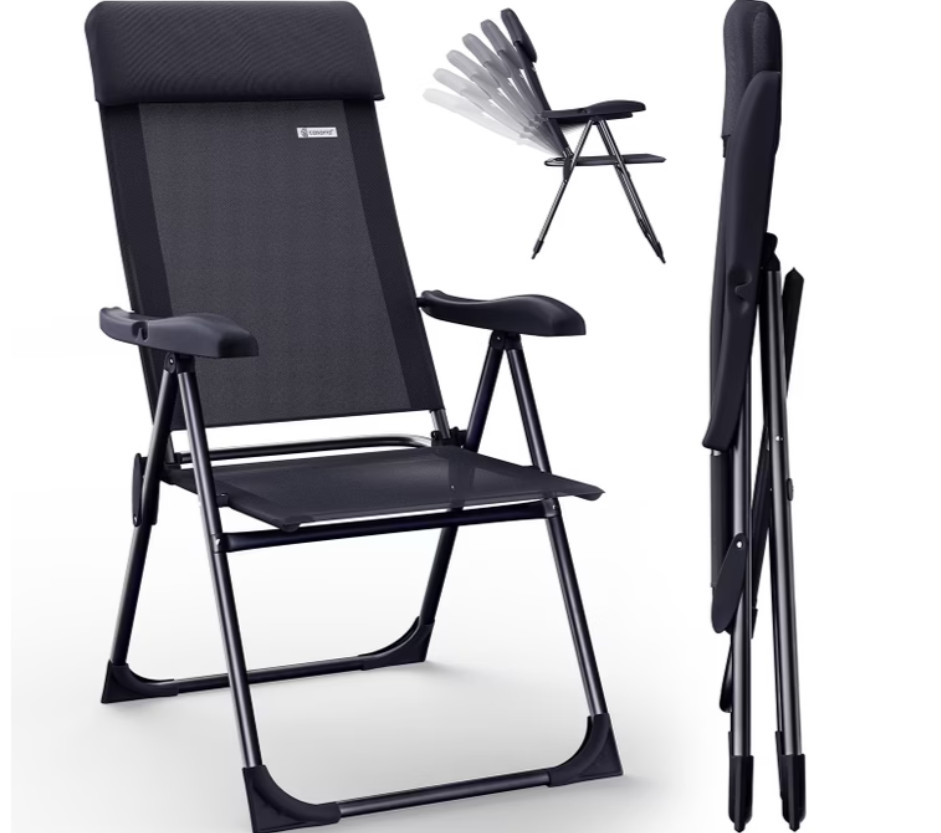 Tyto zahradní židle , dostupné v praktickém balení po dvou, jsou ideálním společníkem na kempování, rybaření, na pláži nebo na zahradě .Vysoké opěradlo nastavitelné v 7 směrech se dokonale přizpůsobí vaší poloze při sezení, extra měkká, odnímatelná opěrka hlavy uvolní váš krk a ergonomicky zakřivené područky zvyšují pohodlí židle. Dalekohled nebo láhev s vodou lze zavěsit na háček hned vedle područky , takže je budete mít po ruce .Potah z polyesterové tkaniny je prodyšný, má vodoodpudivý povlak a je otíratelný . To zajišťuje příjemnou klimatizaci a větrání sedáku, a to i při vysokých teplotách a při delším sezení . Lehký hliníkový rám se rozloží a složí během několika sekund, což umožňuje přenášení židle jednou rukou . Skládá se velmi tence pro snadnou přepravu a šetří místo. Výrazný design podtrhuje její funkčnost. Židle váží 3,18 kg a unese až 110 kg .